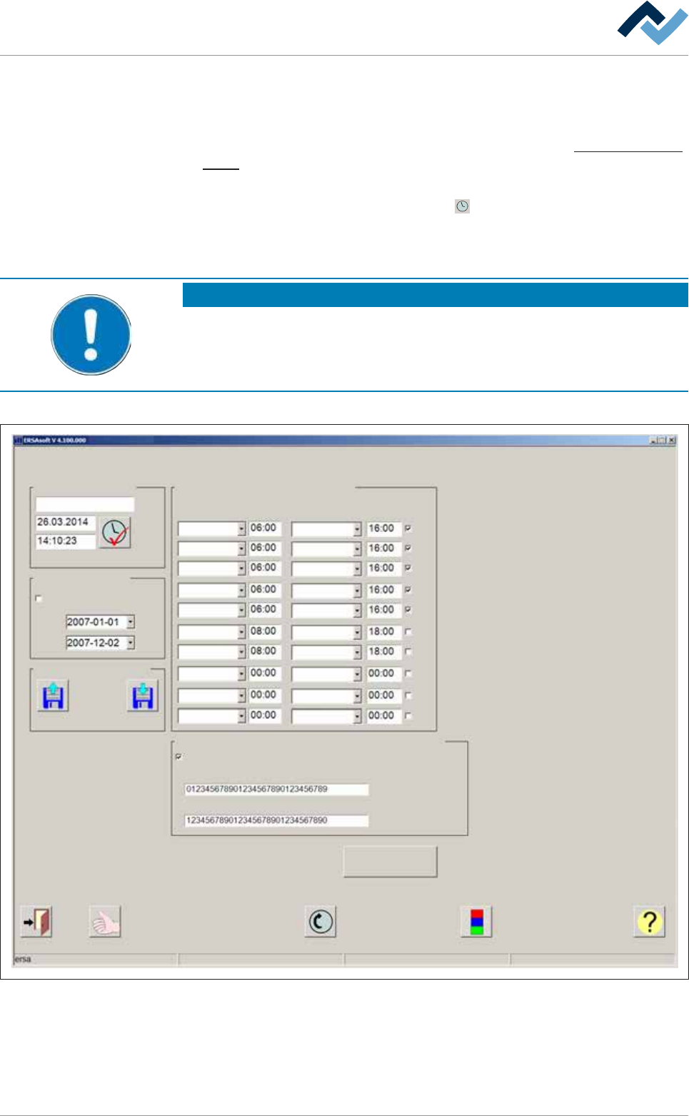 6|功能描述 6.6 [周定时器]设置页面 您可在该对话框中指定机器在哪个时间段内应该处于运行准备就绪状态。这样 比如可以及时将工艺区加热至设置的额定温度。您可以在设置对话框 [提前启 动时间] 中对模块的预开机时间进行设置。为此请阅读章节 [ 预开机时间 ] 设置 页面 [ } 135] 。 ü 打开对话框: a) 在基础对话框顶部工具栏中点击按键 。 ð 当出现输入框 [密码:] 时: b) 输入用户名和正确的密码。 提示 可…