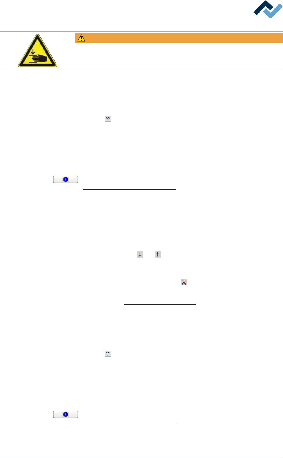 6|功能描述 警告 挤压的危险! 因身体部位被挤压而受伤的风险! a) 不得在机器运行期间进入机器! 手动设置传送带宽度: ü 手动为输送器宽度设置一个设定值: a) 点击[设置値]编辑栏输入一个以[mm]为单位的值。 ð 输送器宽度被调整为该值。 b) 点击 按钮。 输送带的数量会显示在按钮里。 ð 此时输送器宽度被调整好。 当前输送器宽度可以在 [实测值]显示框中看 到,以[mm]为单位。 按钮可能会被显示为多种颜色。 每一个颜…