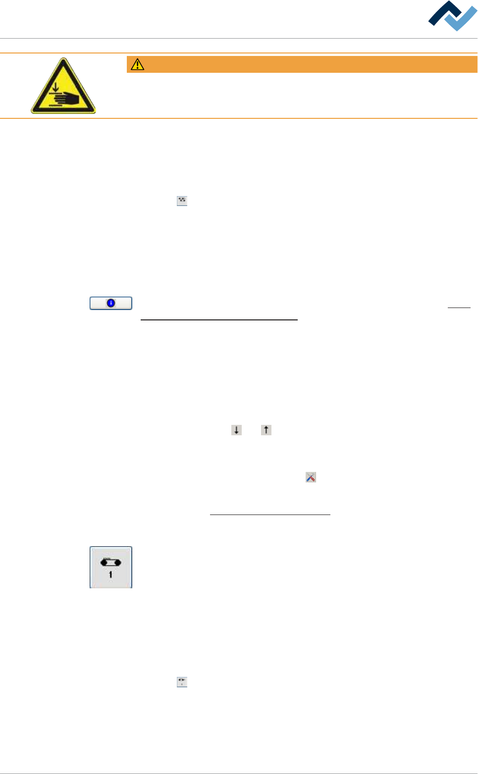 6|功能描述 警告 挤压的危险! 因身体部位被挤压而受伤的风险! a) 不得在机器运行期间进入机器! 手动设置传送带宽度: ü 手动为输送器宽度设置一个设定值: a) 点击[设置値]编辑栏输入一个以[mm]为单位的值。 ð 输送器宽度被调整为该值。 b) 点击 按钮。 输送带的数量会显示在按钮里。 ð 此时输送器宽度被调整好。 当前输送器宽度可以在 [实测值]显示框中看 到,以[mm]为单位。 按钮可能会被显示为多种颜色。 每一个颜…