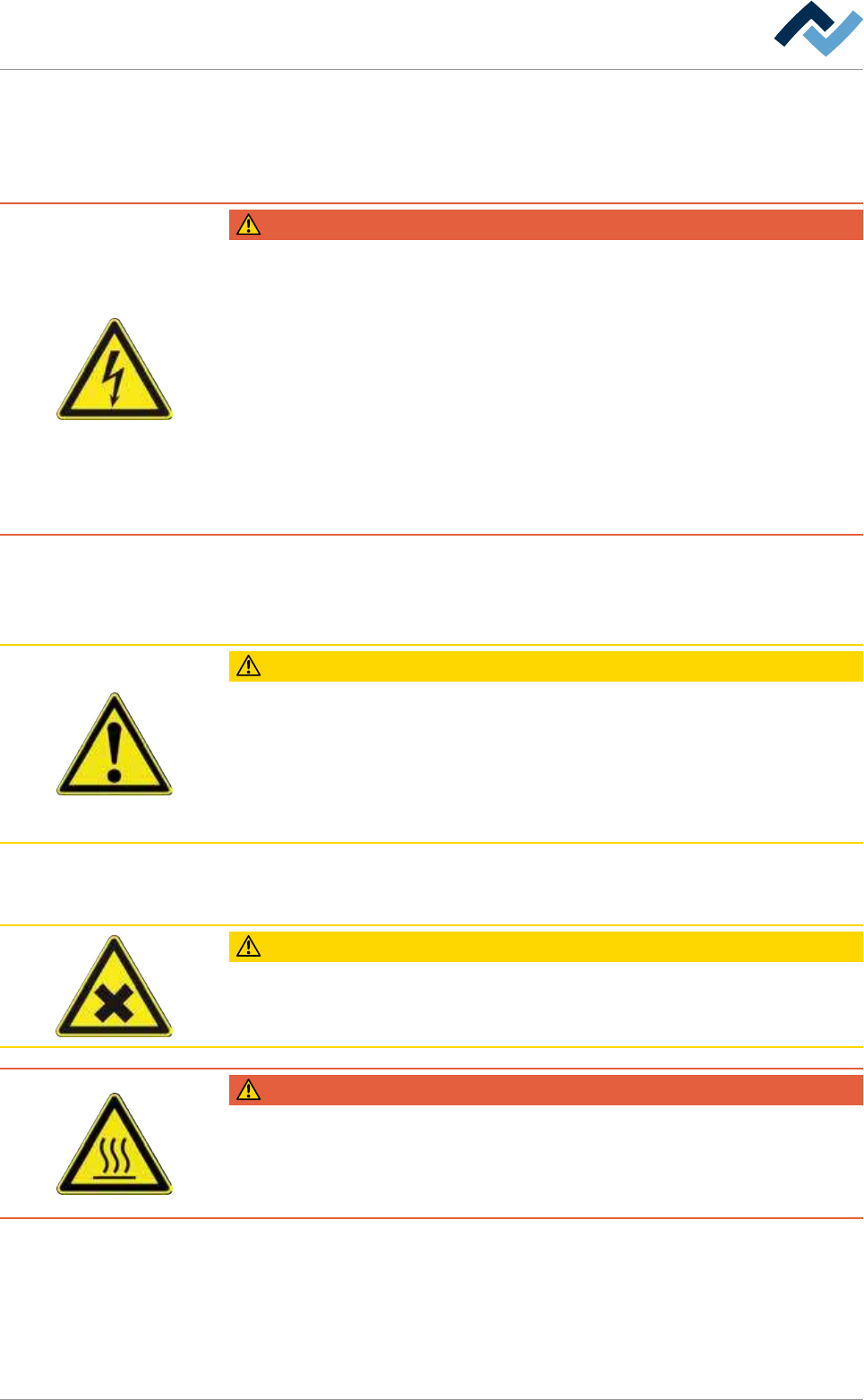 3|安全考量 3.3 相关主体安全说明 3.3.1 处理电设备 危险 电压危险! 电击可导致重大伤亡! ü 在电路系列或机器上的电部件的工作只能由电力技师或受过培训的人员并且 在电力技师监督指导下按照电技术规范进行操作。 a) 用红白安全链将工作区域封闭起来并放置相关的警告标志。 b) 切断所有需要进行检查、保养和修理的机器和系统部件的电源。 c) 对切断电源后的部件,必须先要检查其电压、地线和短路的情况,以及其它 可能会重新启动机…