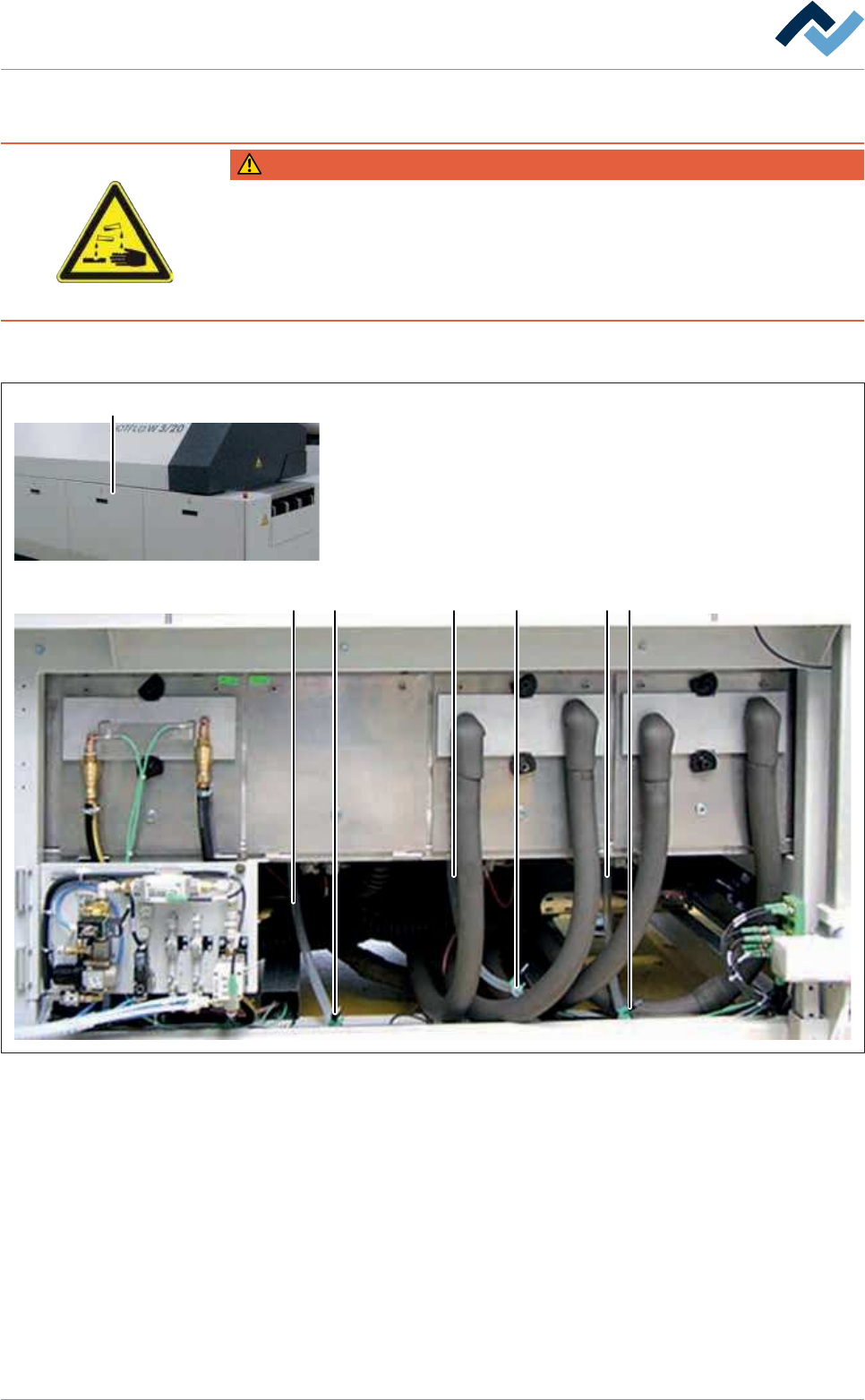 8|服务和保养 8.5.9 底部冷却区域:排放冷凝水 危险 因腐蚀性冷凝水造成的人员损伤和材料损坏的危险! ü 冷凝水可以伤害到皮肤和粘膜! a) 在冷凝管理系统上工作时必须要始终穿着防护衣! b) 配戴护目镜以防止眼镜受伤! c) 始终要配戴合适的防护手套! 用于排出冷凝水的旋塞(1)位于操作端的机器出口上。在去除盖板(2)之后 可以接触到它们:每个冷却区有一个旋塞: 2 1 3 3 3 1 1 图146: 排出冷凝水 Ersa…