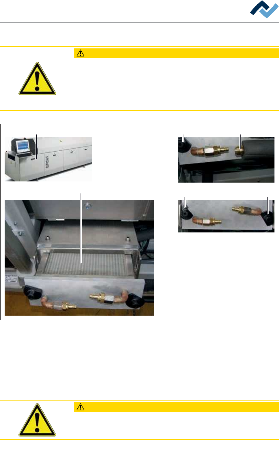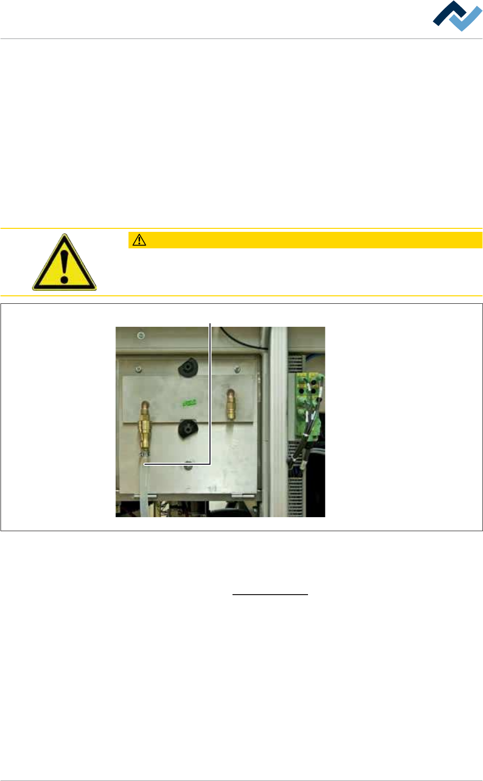 8|服务和保养 8.7.6 温度管理:冷水热交换器的清洁 小心 材料损坏的风险! ü 热交换器翅片都非常敏感,容易变形。 这可以导致空气流的减少和冷却能 力的降低! a) 不得使用任何压缩空气和尖锐的物体来清洁机器! b) 用适当的工具将扭曲的翅片拉直,比如一个翅片梳。 c) 请阅读制造商的保养说明。 热交换器位于操作侧的机器的出料口。 在打开机盖板(2)后可以进入它: 2 5 3 3 4 3 图164: 冷水热交换器 ü 拆除并…