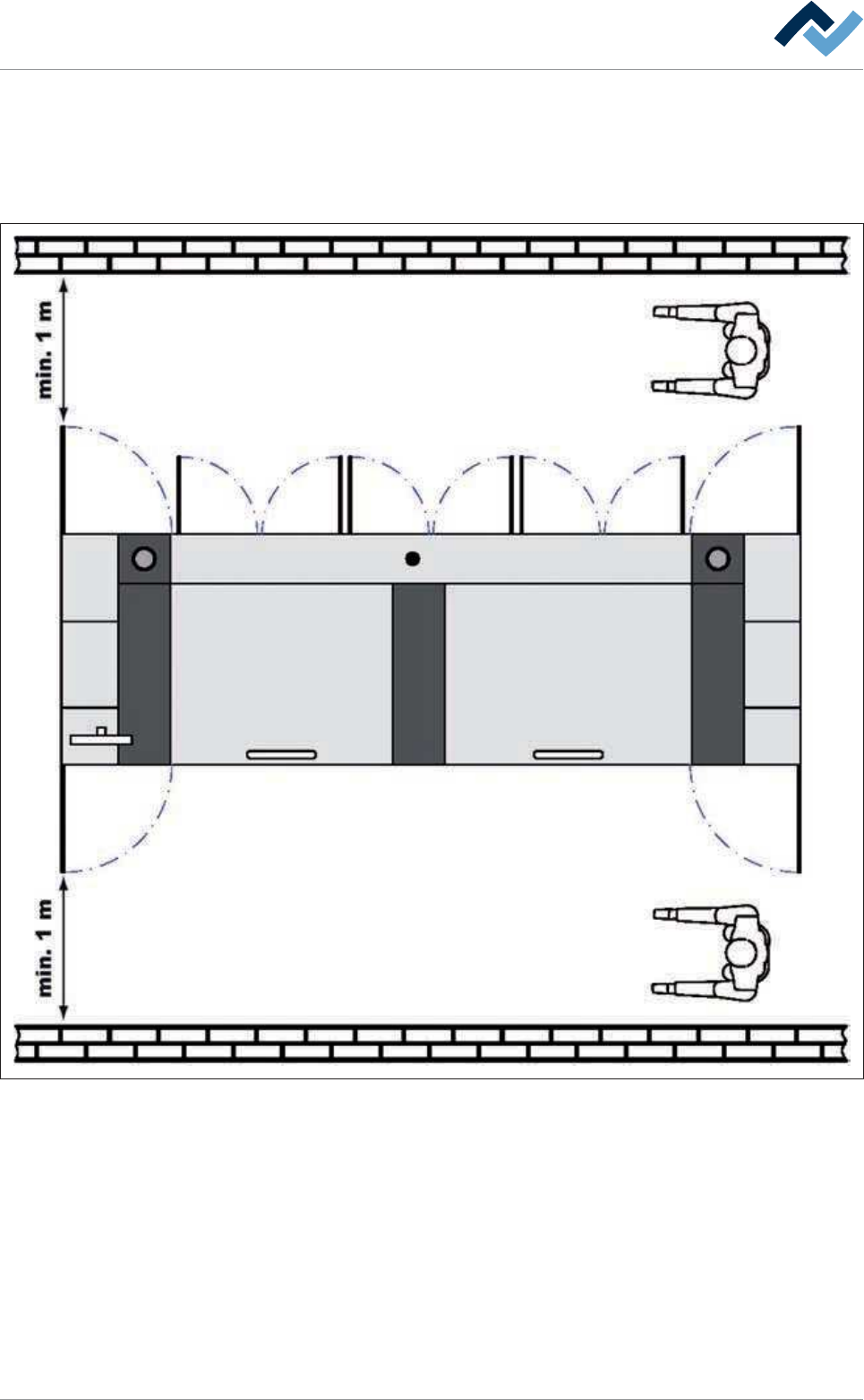 在打开门和护罩时,在机器前后需要至少 1 米宽的通道。为此请注意下图: