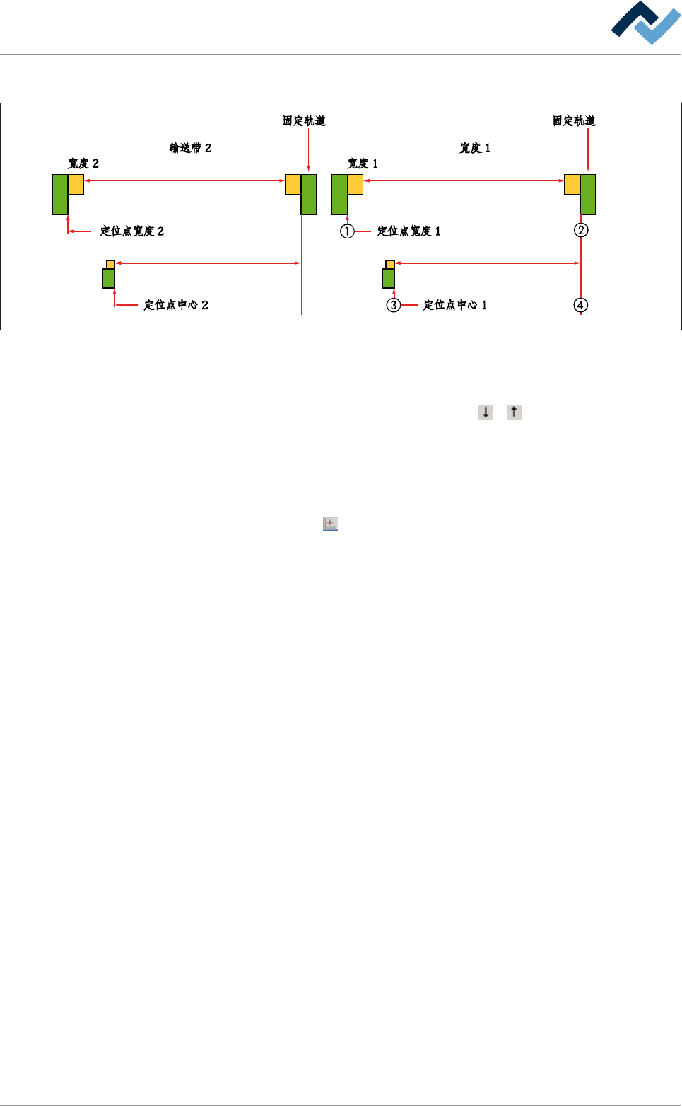5|调试 范例 a),带有硬件限位开关,使用基准点法。 图23: 定位双带系统的宽度调整和中心支架 ü 定位中心支架: a) 打开[中央支撑] 编辑页面。 b) 在[中央支撑轨道宽度调节 1]框中,点住 或 按钮。 ð 这时可移动输送轨道从硬件基准开关移向输送器的中心。 ð 一旦脱离了基准开关后: c) 放开按钮。 d) 打开[发动机]中央支撑设置页面: e) 点击[设置]下的 按钮。 ð 定位程序开始。 这时可移动输送轨道开始向…