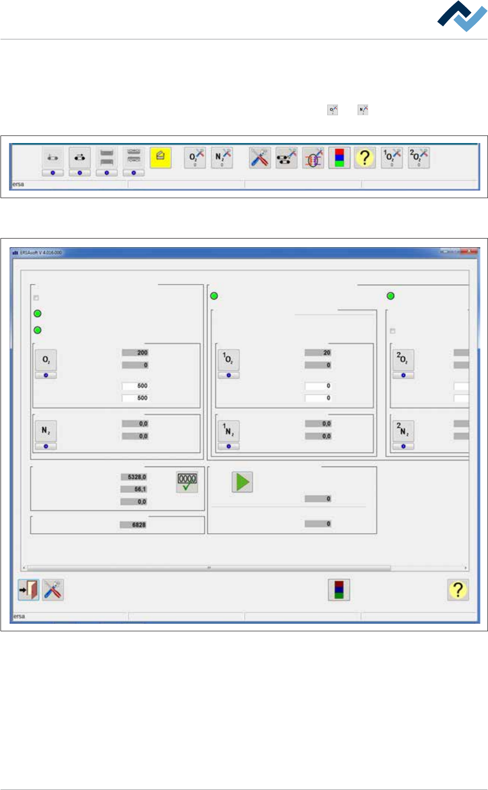 5|调试 5.4.9.7 检查氮气供给量和剩余氧气量 ü 打开输入对话框 [N2/O2]: a) 打开基础对话框。 b) 在基础对话框底部工具栏中点击按键 或 。在底部工具栏中也可以 有多个该按键,但始终打开相同的输入对话框。 维护模式 图26: 基础对话框的底部工具栏 ð 出现输入对话框 [氮气/氧气]: 氮气/氧气 氧气控制/N2调节 维护模式 编辑对话框 氧气控制 含氧分析仪已准备好 氮气压力OK 含氧量(O2) 设置値 实…