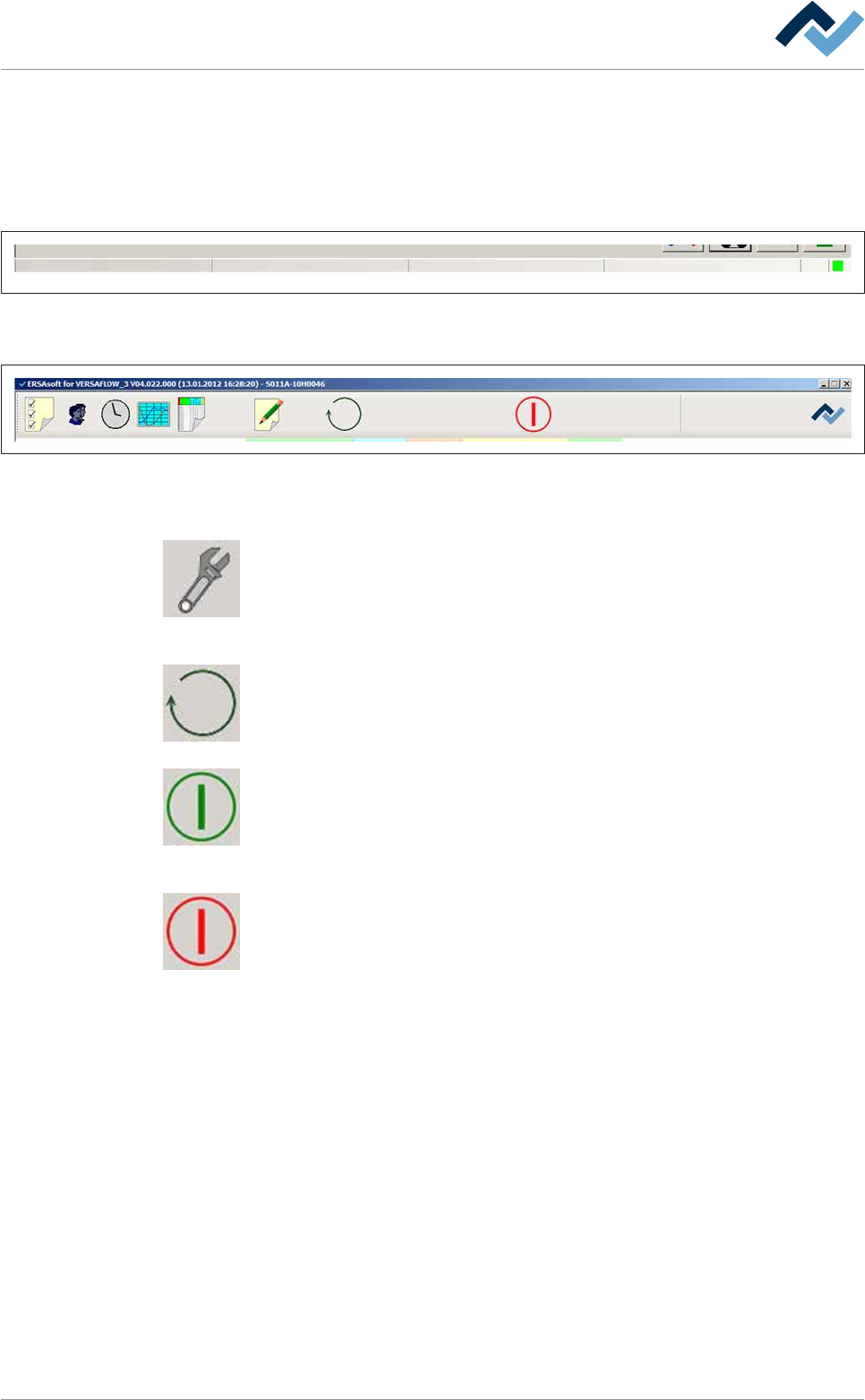6|功能描述 6.13.1 改变操作模式 机器的几个最重要的操作模式显示在流程图中的各个矩形框中。这些矩形框中 的文字会始终显示在开始对话框的状态栏中。在这里你可以随时读取当前的操 作模式。 状态栏位于屏幕的下边缘: 用户: 无 自动状态 程序库 程序 图68: 状态栏显示出当前登录的用户和当前的机器操作模式。 此外,程序库和当前启动的焊接程序会自动显示出来。 在开始对话框的顶部工具栏中可见这些用于调节操作模式的按钮。 预热 焊接…