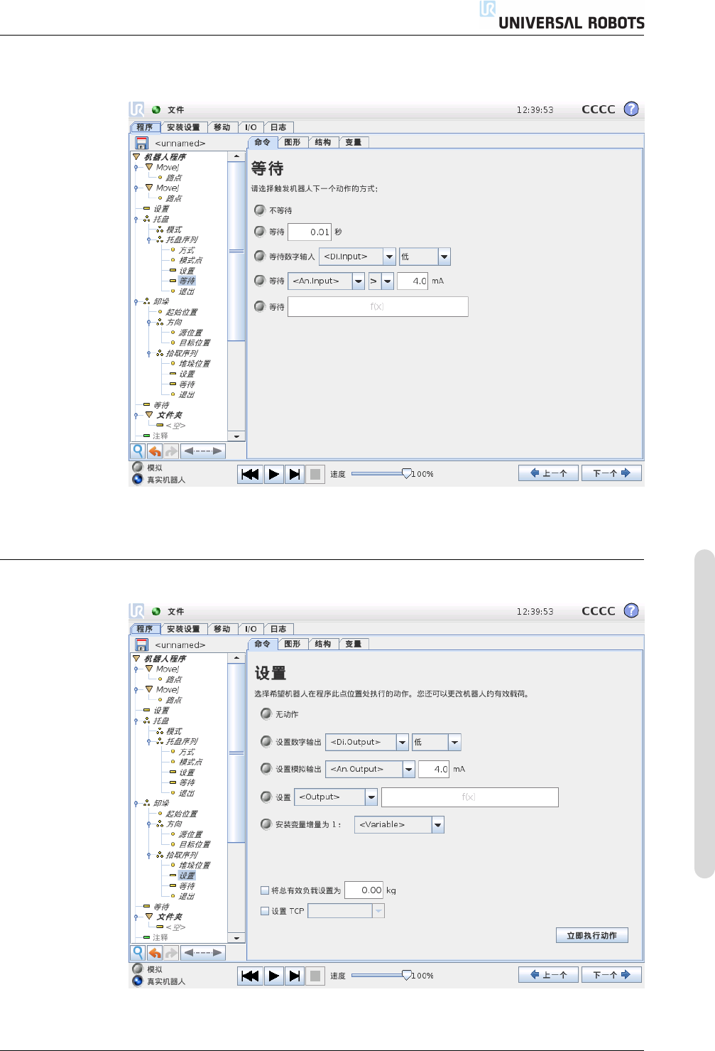14.9 命令:等待 14.9 命令:等待 “ 等待 ” 指定的时间或等待 I/O 信号。 14.10 命令:设置 将数字输出或模拟输出设置为给定值。 版本 3.2 (rev. 18629) . . 版权所有 © 2009-2015 Universal Rob ots A/S 。保留所有权利。 I I-65 CB3