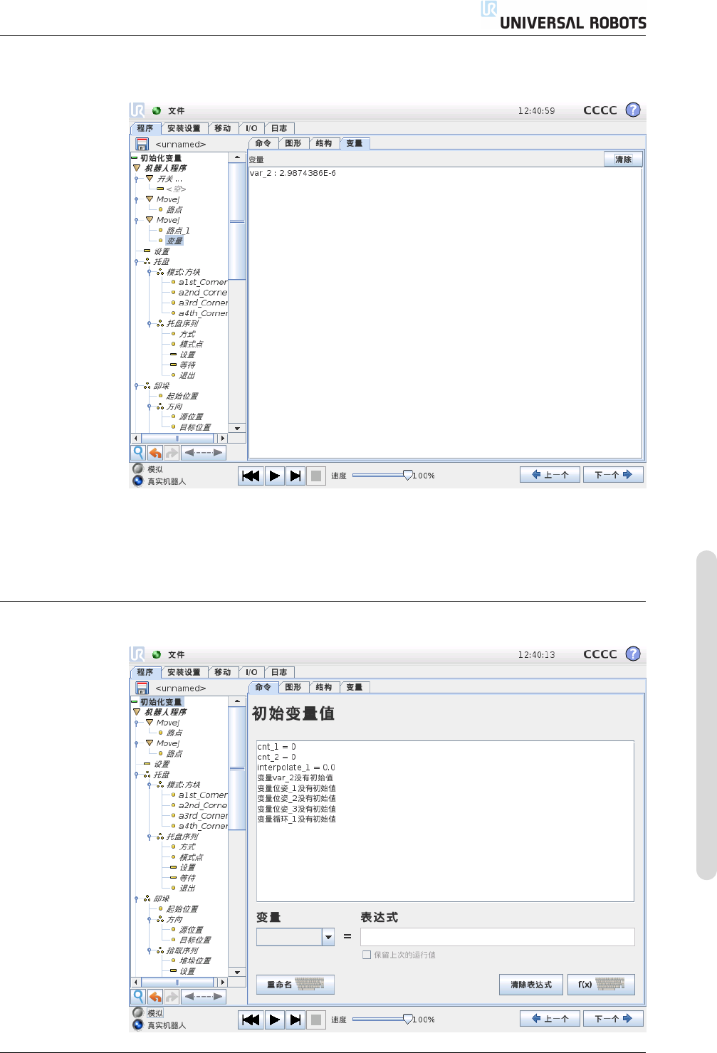 14.32 命令:变量初始化 此屏幕允许在程序(和任何线程)开始执行之前设置变量值。 可从 变 量列 表中 单 击相 应 的变 量来 选 择变 量,也 可 以使 用 变量 选择 器 框选 择 变量。 对 于 所 选 变 量,可 以 输 入 一 个 表 达 式, 程 序 开 始 执 行 时 将 使 用 此 表 达 式 设 置 变 量 值。 如果选中 “ 希望保留最后的运行值 ” 复选框,则变量将被初始化为 变量 选项卡上所显 示的值 (如…