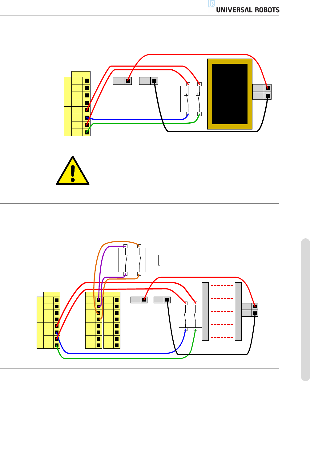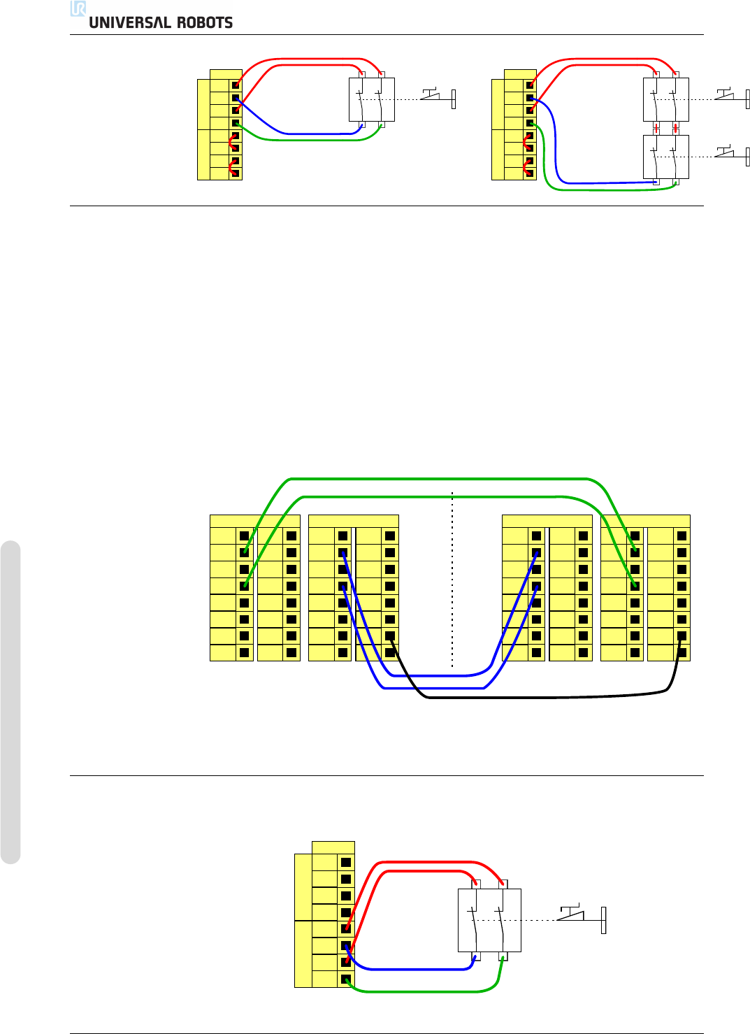 5.3 控制器 I/O 24V EI1 24V SI0 24V SI1 24V EI0 Safety Safeguard Stop Emergency Stop 24V EI1 24V SI0 24V SI1 24V EI0 Safety Safeguard Stop Emergency Stop 5.3.2.3 与其他机器共享紧急停止 当机器 人与 其他 机器搭 配使 用时,往 往需 要设置 一条 公共的 紧急 停止 电路。通 过设 …