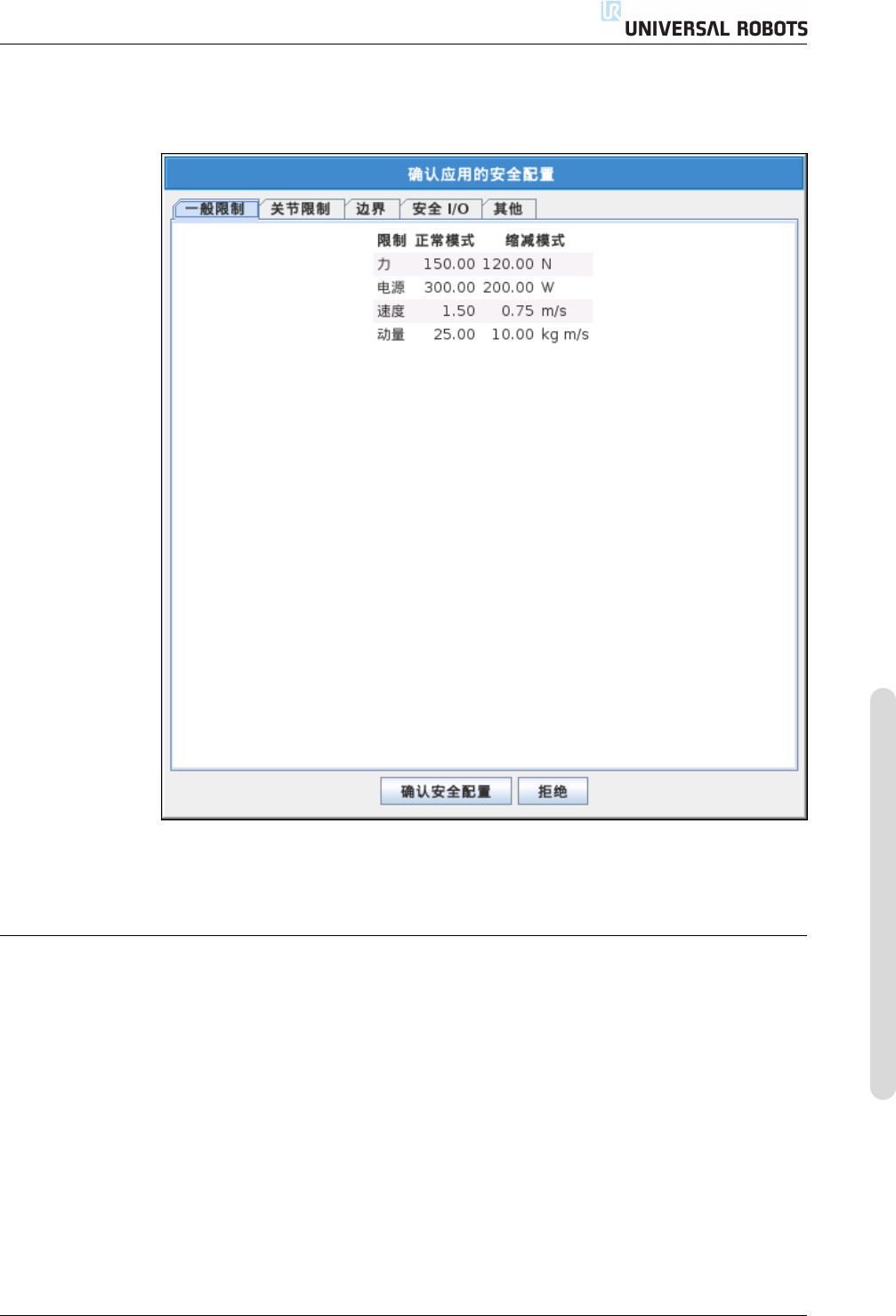 安全配置解锁后,如果更改了安全配置,机器人手臂将被切断电源。应用更改或恢