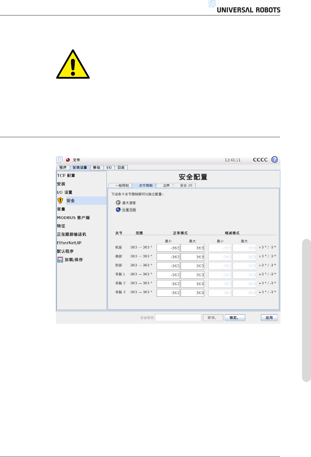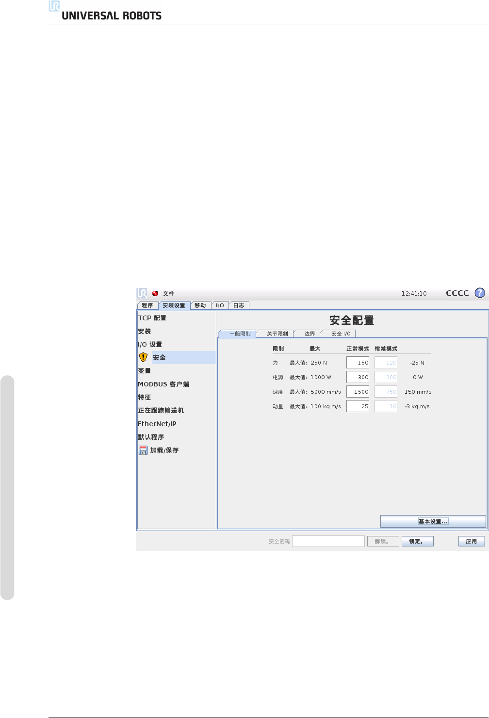 10.11 关节限制 负号只 是用 于表 明要从 实际 输入的 值中 减去 公差。如 果机 器人手 臂超 过限制 (无公 差) ,安全系统将实施 0 类停机。 警告 : 速 度限 制 只 适 用 机 器人 TCP , 因 此 机 器 人手 臂 的 其 他 部 分可 以 比 定义值更快的速度移动。 切换 至 基本 设 置 按 下 基 本 设置 ... 按 钮,切 换 至一 般 限 制基 本 设置 屏 幕,此 时 所有 一般限 制都 会重 …