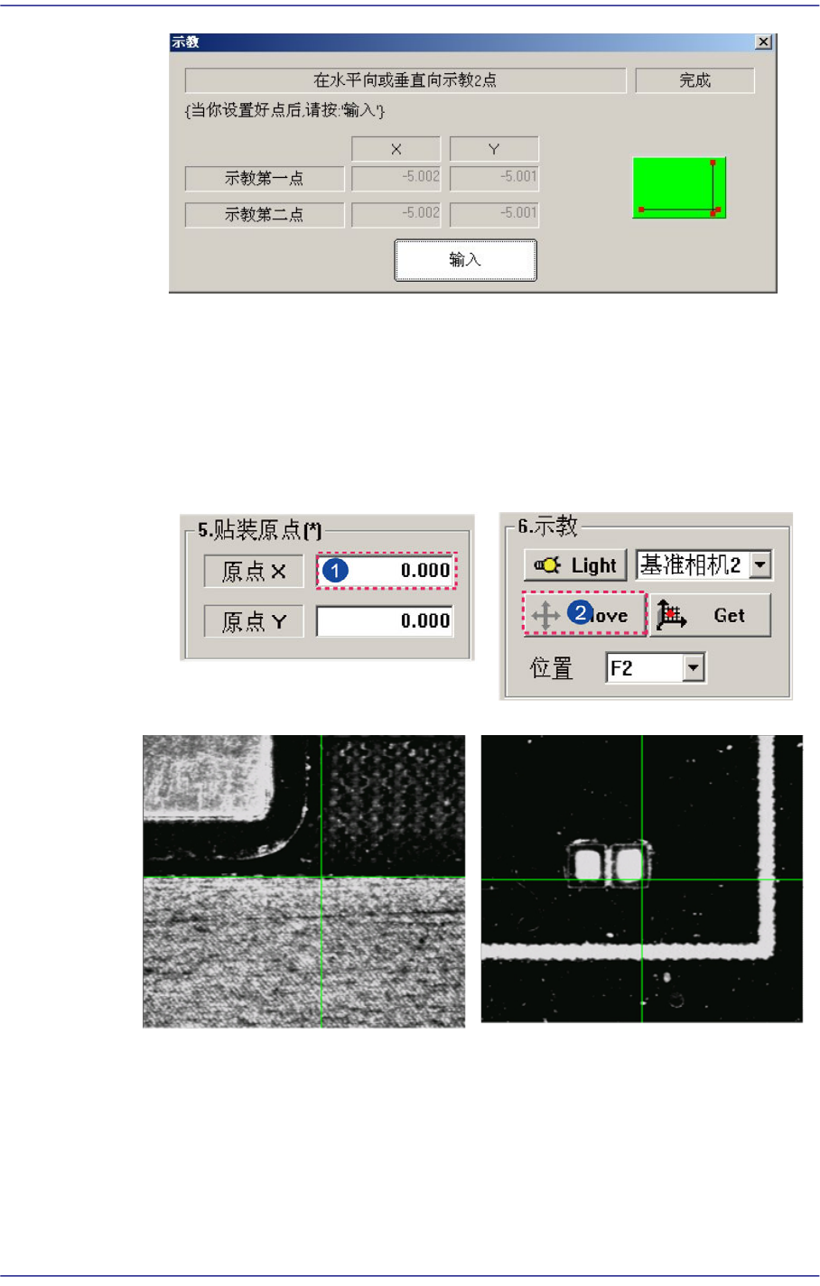 示教PCB上横向,竖向平行位置的2个点中的第一点。示教后,按下” 输入”