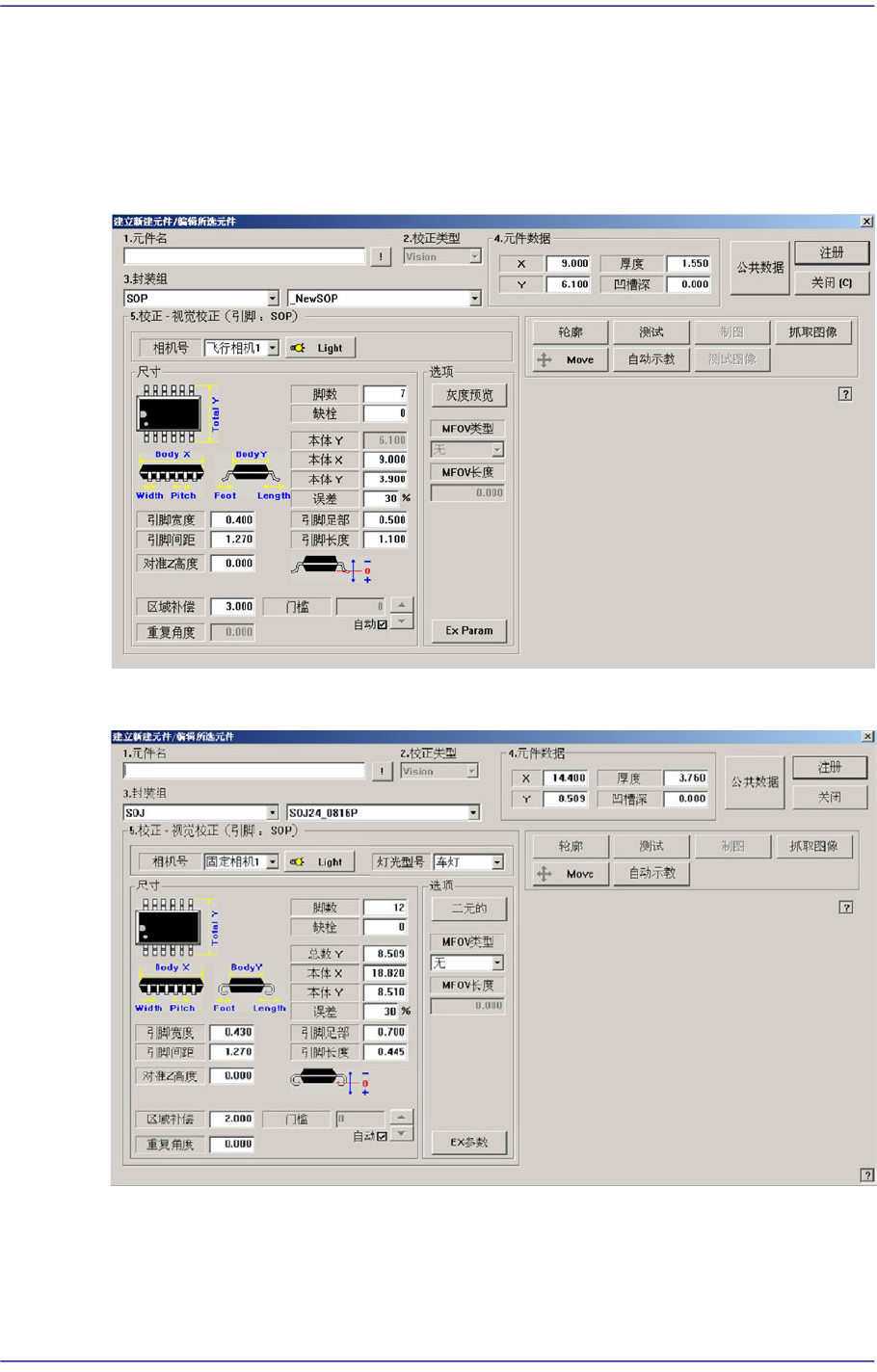 7-55 元件的登记 图 7.20 “ 封装组 = SOP2” 时的对话框 图 7.21 “ 封装组 = SOJ2” 时的对话框 < 相机号 > 组合框 选择识别部品的摄象机。 详细事项请参照 “ 7 .1 .1 共同 Align Data ” 。 按钮 设定识别部品用摄象机的照明度。 详细事项请参照 “ 7.1.1 共同 Align Data ” 。 < 尺寸 > 领域 设定排列尺寸。