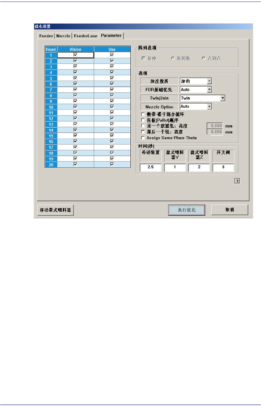 10-10 Advanced Flexible Placer DEC AN F2 Administrator’s Guide < 时间 ( sec)> 编辑 盒 领域 此领域用来输入执行设备的每个动作所需的时间, 并计算在优化中 的作业 时 间。 另外, 盘 式喂料器 Y and 盘式喂料器 Z 的值可以影响作业顺序的决定。 因此, 为了提高作业效率及估算作业时间的精确度要输入尽可能接 近真实 值的 数值。 传送装置…
