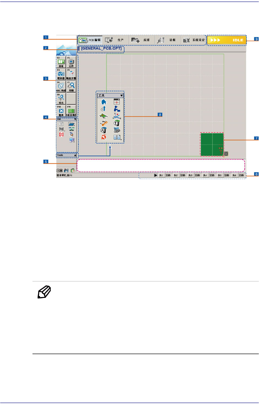 前言 xix 画面显示 本设备的 MMI 的基本画面如下。 1: 表示主菜单工具栏 2: 显示正在操作中的 PCB 文件名。 3: 表示辅助菜单工具栏。 4: 显示 File 菜单。 ( 新建 , 打开 , 另存为 , 合并元件库 , Show/Hide err or message, W i ndows T ool) 5: Err or Message widow . 6: 显示装在各 Head 的 Nozzle 的状态。 7: …
