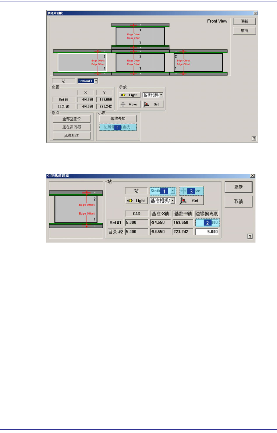 14-31 Machine Calibration 6. < 站 > 目录框中选择要校对的 Station 。 7. 用鼠标选择 参考点 #1 相应的 < 边偏移 > 编辑框, 点击 < 移动相机 > 按扭。 8. 那么, 基准相机移动到该 Fiducial Mark 位置。 上升 Backup T able , 利用 T e achbox 点击 ’AXIS’ 按扭选择 XY , 使 V ision …