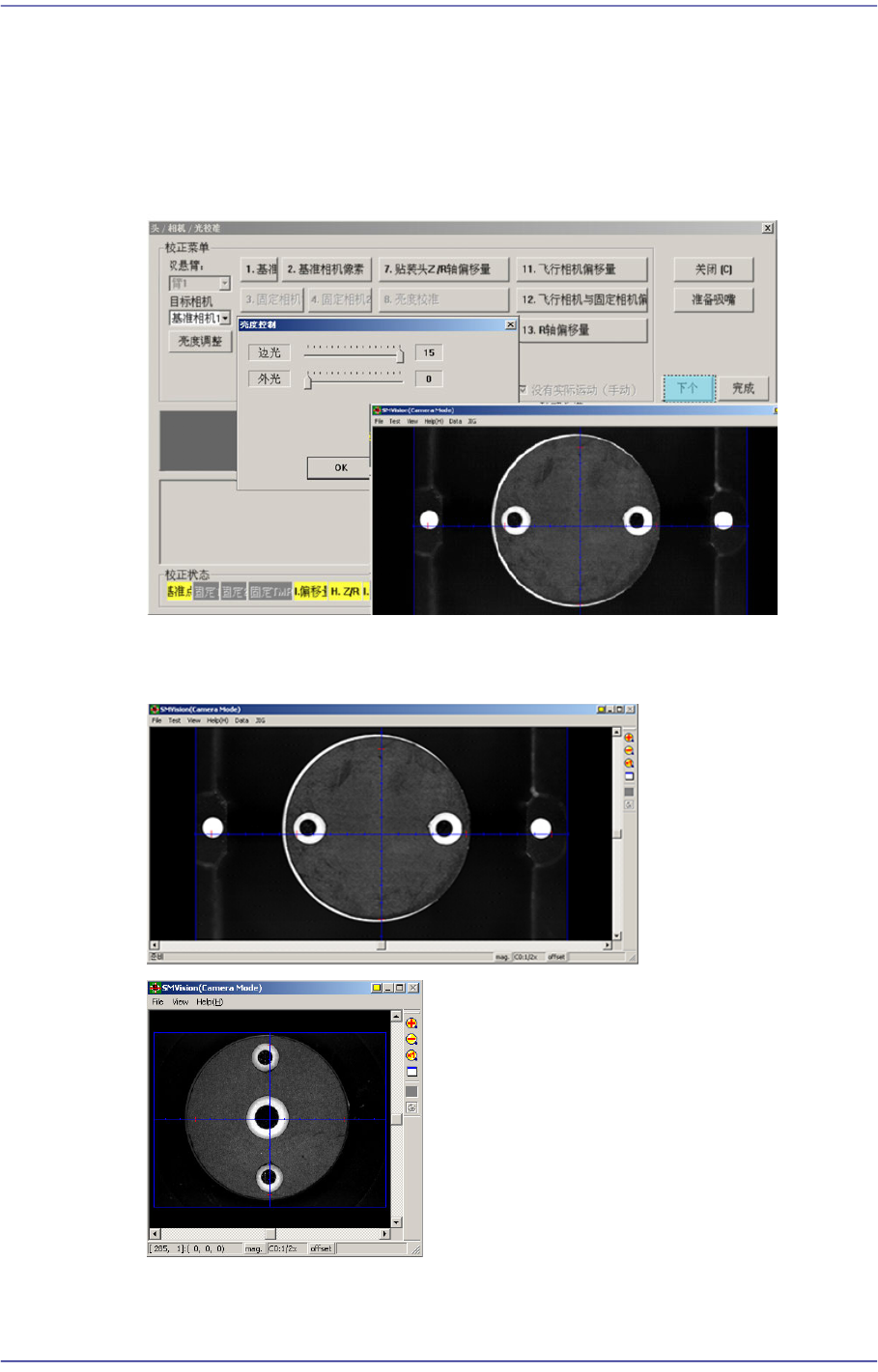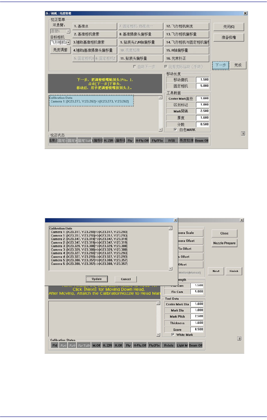 14-61 Machine Calibration 7. 那么, 磁头 1 上升到飞 行相机的 Align 高度, 关闭 Mirror 。 然 后 在消息 窗显示 ” 准 备标准。 8. 对于标准, 点击 [ 下一步 ].” 消息。 此时在 < 目标摄像 > 组合框中选择 ” 飞行 相机 1” 点击 < 亮度 > 按钮, 在 ” 亮度控制 ” 对话框 中 SMV ison 显示的 Calibration T oo…