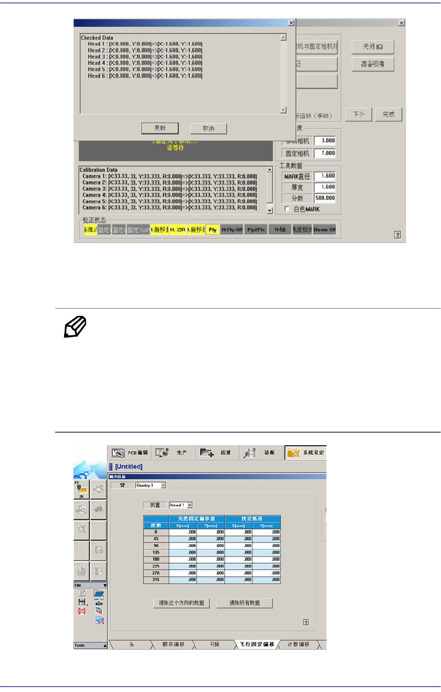 14-66 Advanced Flexible Placer DECAN F2 Admi nistrator’s Guide 1 1. 完成对 Gantry1 的校正后 在 <Gantry> 组合框中选择 ’Gantry2’ 以相同的方法执行 校正。 结果值在 System Setup 菜单的 Camera 对话框中可以确认。 备 注 Head-Fly Off set 的校正基准值如下。 (FOV 25 MEGA) [ 单位…
