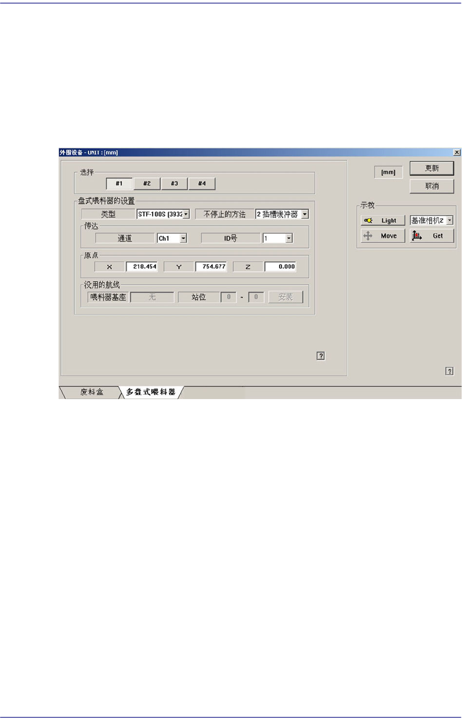 使用已选择的盘式喂料器单位时,设定被该盘式占有的喂料器基座单位和 Slot。