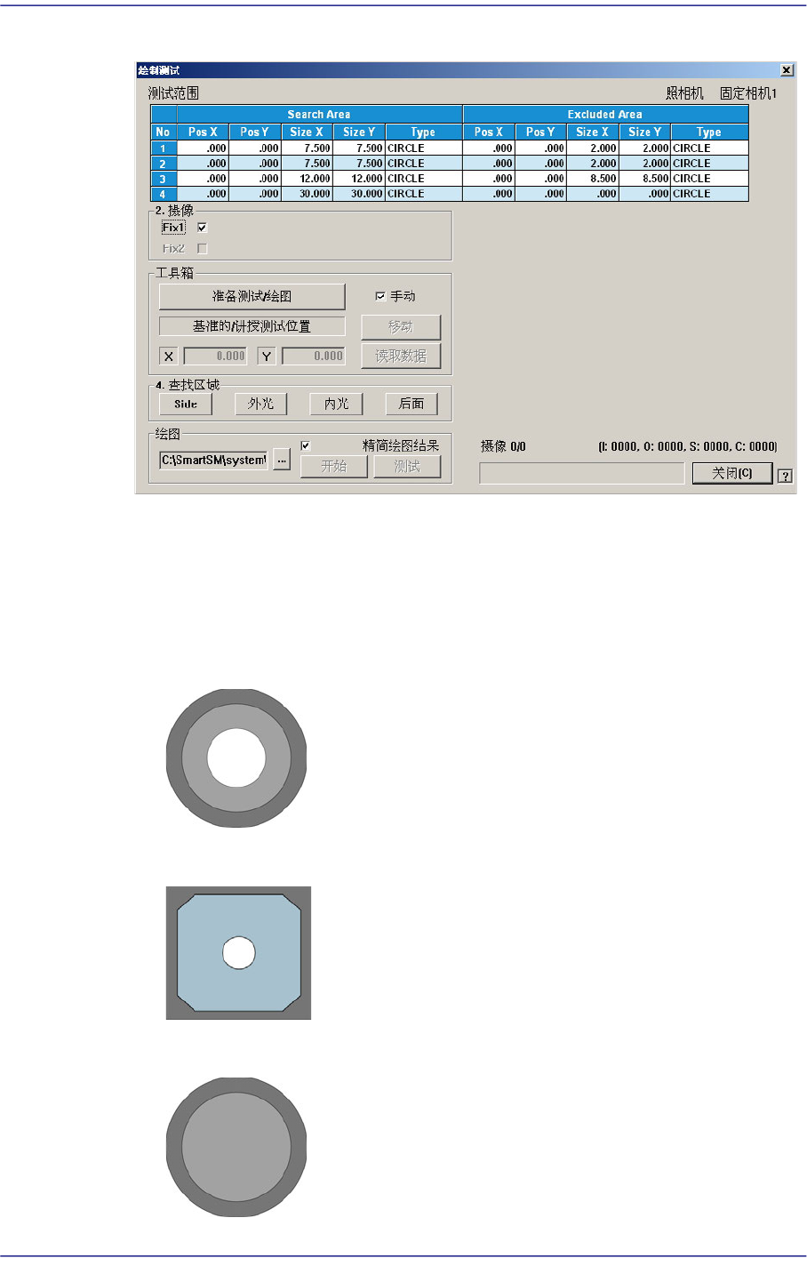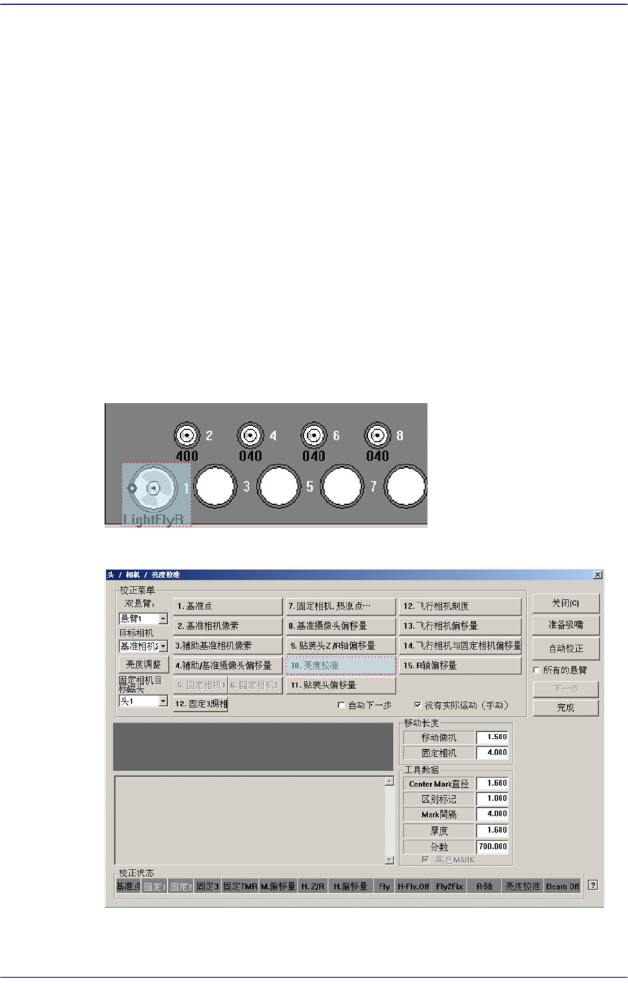 15-21 系统设置 <2. 摄像 > 领域 选择执行照明亮度 T est 或 Mapping 的 Camera 。 已激化的 Camera 可同时指 定。 <3. 工具箱 > 领域 执行 T est 或 Mapping 的准备作业 。 < 准备 测 试 / 绘图 > 按钮 安装在 Head 的所有吸嘴, 返还给对应 ANC 孔。 之 前 ANC1 号孔中配置校 正用 LightFly 吸…