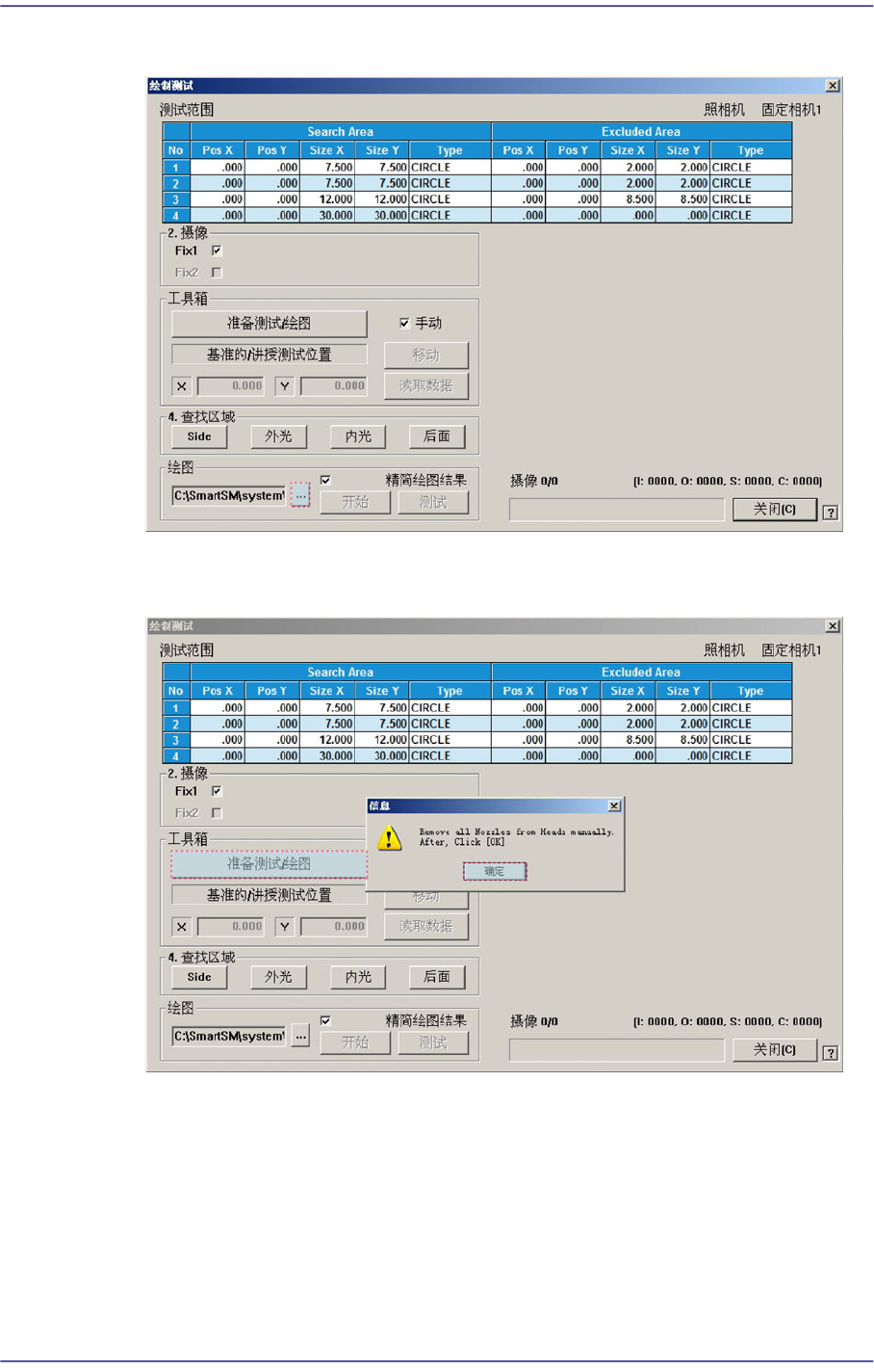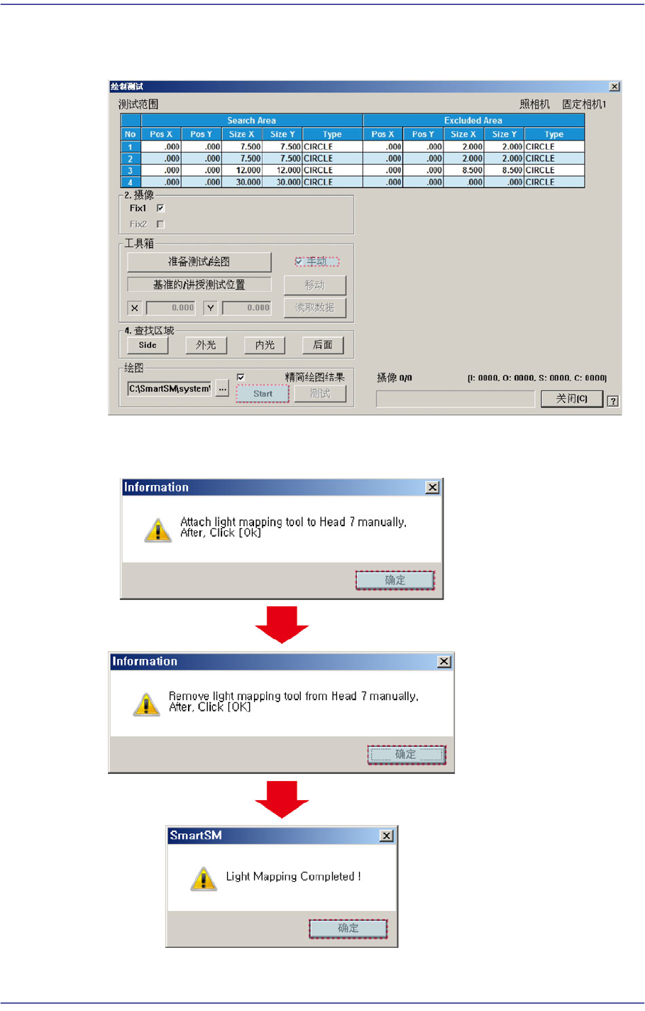 15-33 系统设置 5. 选择 <3. T ool Setting> 领域的 <Manua l> 复选框。 单击 <<Mapping>> 领域的 <S tart> 按钮后把 Light Mapping T ool 插入 7 号 Head 。 6. Light Mapping 完毕后会出现下列对话框。 单击 < 确定 > 按钮就会出现 T est 用对话 框。