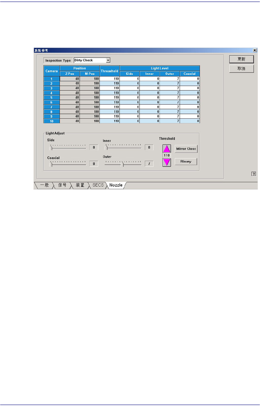 针对识别吸嘴尖头污染程度的视觉的Threshold进行设置。