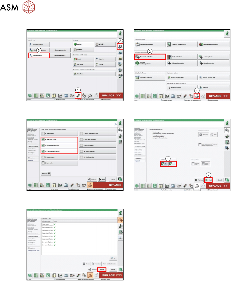 1. Log on as Machine service (1-3). 2. Click Calibration (1).