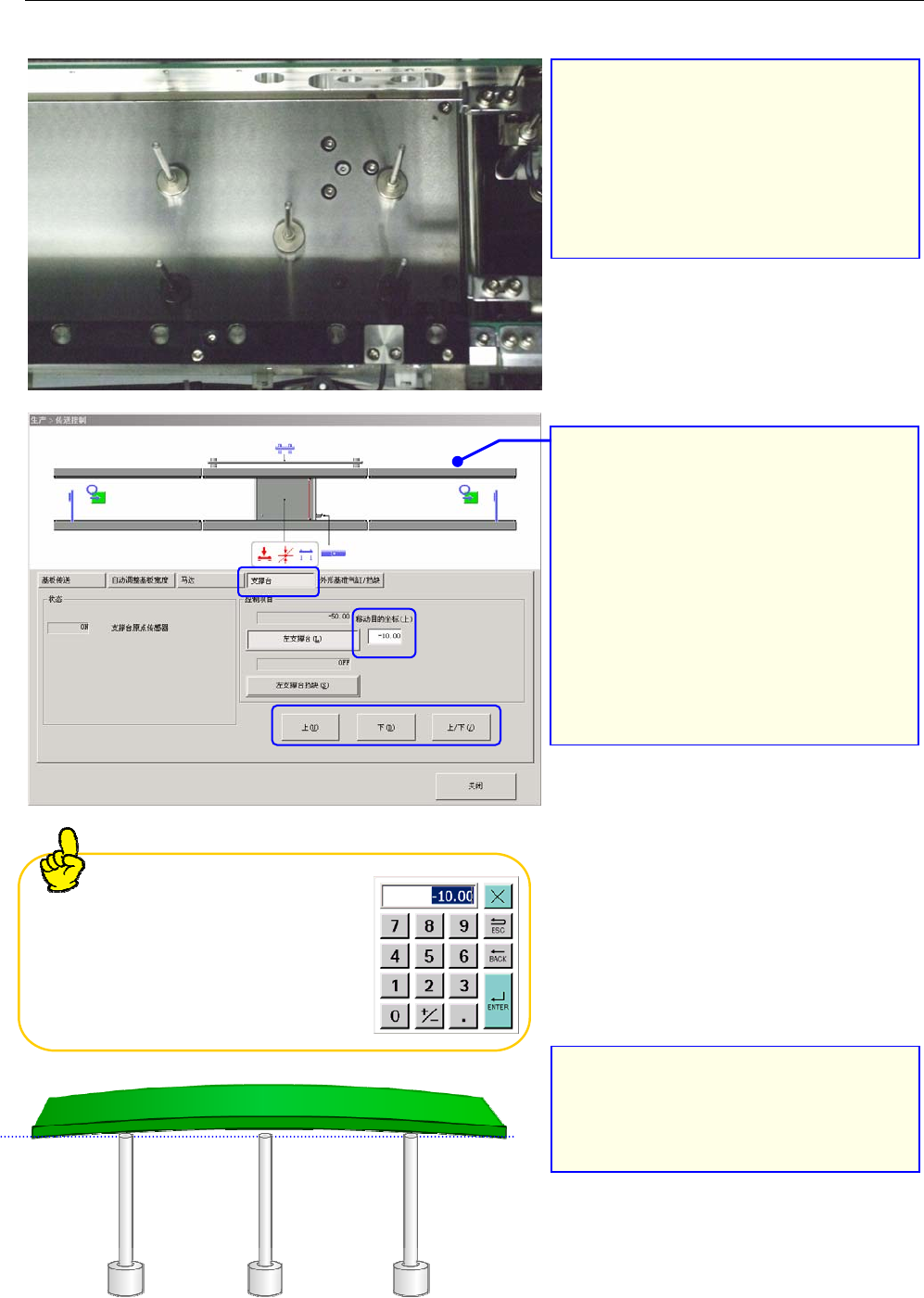 操作手册 I (3) 支撑销的配置 夹紧基板时,要配置支撑销,以防止向下弯翘。 使用厚度薄的基板和大型基板时,因弯翘度大,建议设置支撑销。 *两面贴片的基板, 配置支撑销时要注意不 要让支撑销碰到基板背面已贴装好的元 件。 *请确认支撑销下面没有附着芯片等物。 1. 根据基板的形状, 在支撑台上配置支 撑销。 ③ 控制操作台架的升、降。 例)基板厚度为 1.6mm 时, 请输入“-1.60” 。 ② 输入基板厚度尺寸,必须输入负数。 ①…