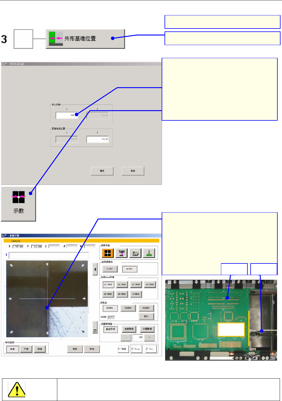 操作手册 I Step5-3 执行贴片基准示教。 在(Ste p5- 1)变更了挡块位置时,基板的外 形基准位置(停止位置)会出现变化 ,需要重新对准「外形 基准位置」 。 1. 事先进行「搬入基板」 2. 请按下[贴片基准示教]。 ②从功能栏中选择[示教]。 ①选择「停止挡销」的「X」输入焦点。 3. 显示「外形基准位置」设置画面 。 看着叠加画面(OCC 拍摄画面) ,直接触 摸摄像机图像,把基板和挡块的接触线 位置移到监视器的 X…