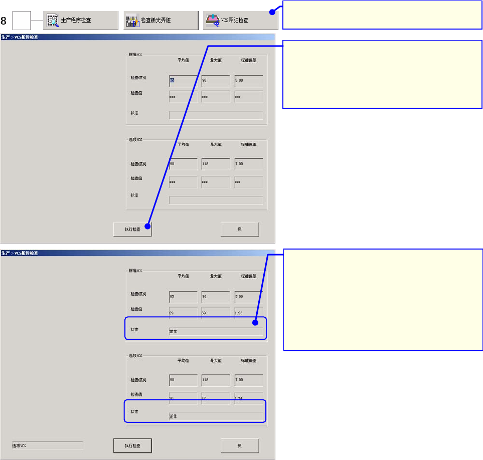 操作手册 I 1. 按下[VCS 弄脏检查] 。 2. 按下[执行检查]。 如果安装有选购项 VCS 时,通过一次检 查,即可进行标准 (装备) 、选购项的脏 污检查。 *发现 “弄脏” 时, 请按照 『操作手册 II』 的「第 3 章 维护」进行 VCS 的清扫。 3. 确认状态是否为正常。 3-23