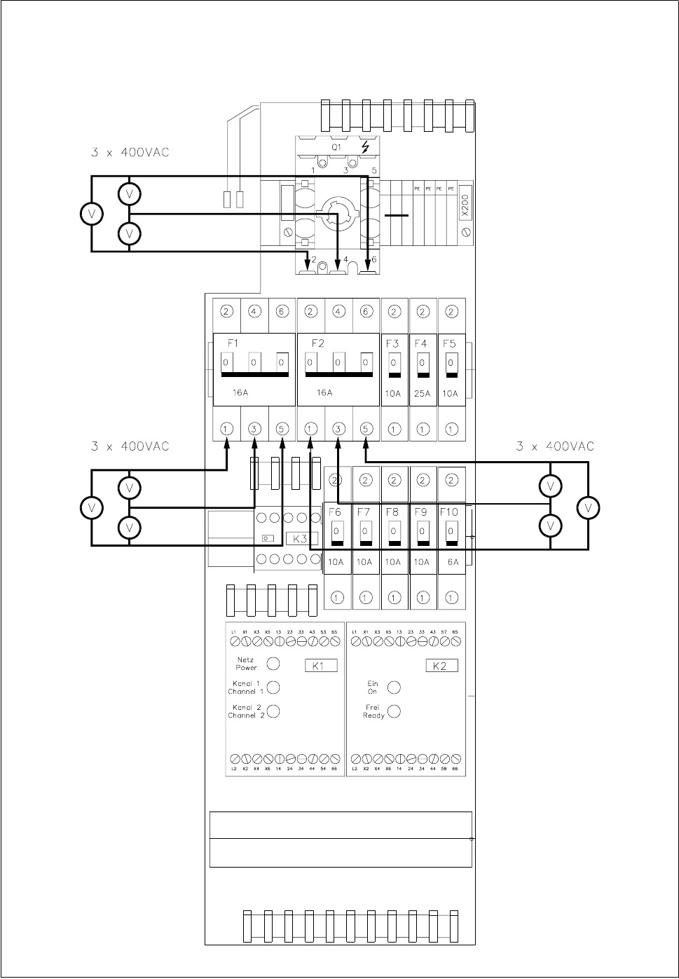 ● Switch on automatic circuit-breaker F1. At automatic circuit-breaker F2 you should measure 3 x 400 VAC