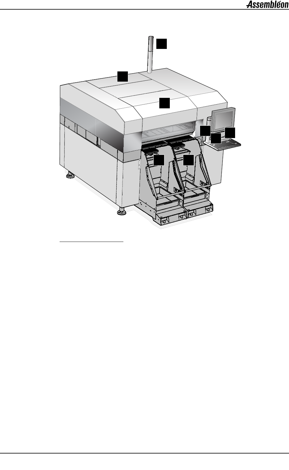 第 1 章 操作手册 4022 593 51292 6A X - 2 0 1 07.02 UM-00066.fm 1.1 正面部件 图 1 正面 1. 灯柱,显示机器状态: 绿色,机器处于处理模式。 蓝色,机器处于错误模式。 白色,机器处于维护模式或空闲模 式。 2. 键盘和触摸屏。 3. 急停按钮。 4. 前部和后部保护盖。 5. 供料器料车。 6. 开始按钮。 1 2 5 4 4 3 5 6