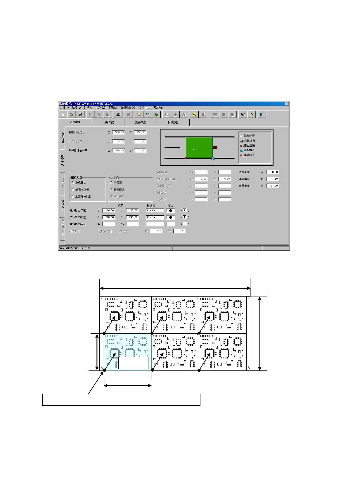 ②设置基板位置基准和电路原点,输入电路数和电路间距的信息。