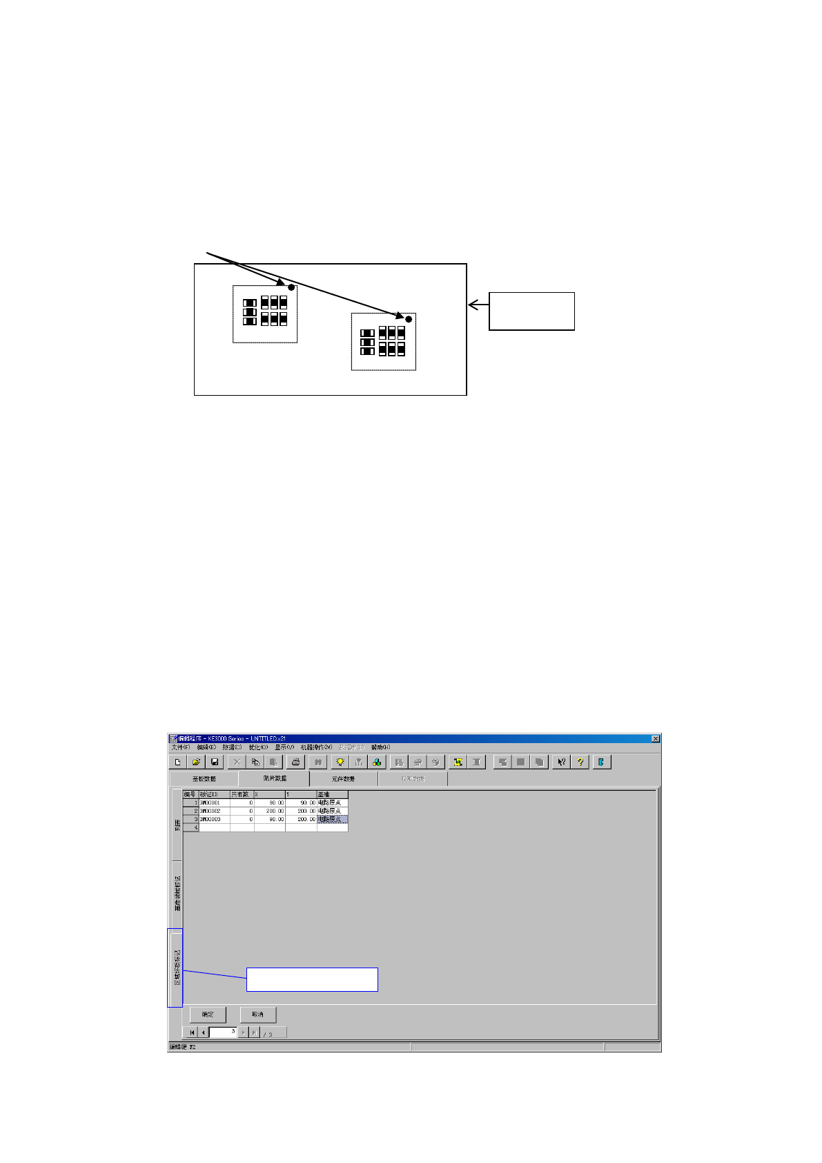 操作手册Ⅱ 3- 44 “ 画面显示内容 ” · 标记 ID : 输入标记 ID 。最 多可输入 8 个半角文 字。 省略时将自动分 配。 · 共有数 : 显示当打开区域标记 画面时的,参照 标记群组的贴 片数据点数。 但不能编辑。 · 标记 1(2 , 3)X : 输入 标记的 X 坐标。 · 标记 1(2 , 3)Y : 输入 标记的 Y 坐标。 · 标记名 : 输入标记的名称。 · 标记 1(2 , 3)T I : 显示标记的 图…