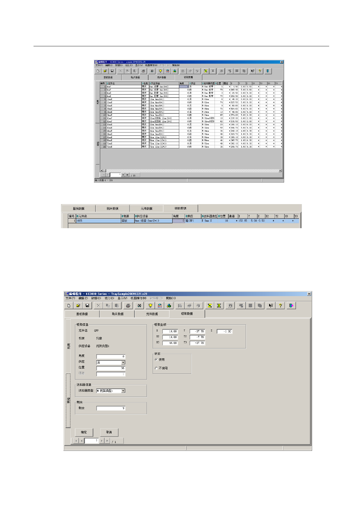 操作手册Ⅱ 3- 11 8 3-3-6-1 吸取数据画面的显示 要显示吸取数据 时,会先打开列 表画面。 如果要在列表画 面里使用电动供 料器,项 目会显示浅蓝色 ,如下所示。 在列表画面中选择 “ 表格 ” 选项卡,或双击列表画面,即可打开如下显示焦点 所在行数据的表格画 面。 元件名、包装、 供应设备分别显 示贴片数 据及元件数据中 所输入的数值 。 可在表格画面中 编辑 “ 角度 ” 、 “ 供应 ” 、 “ 位置 ” 、 “ 通…
