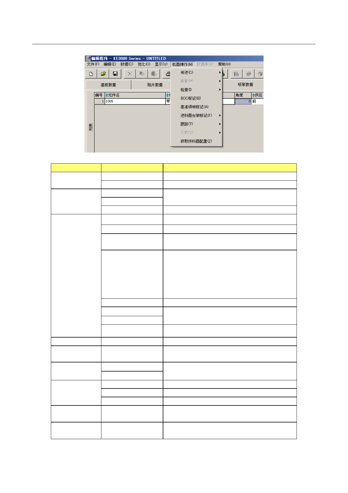 操作手册Ⅱ 3- 205 3-5-4 机器操作 操作主机的实际 运行,执行各种 作业。菜 单上分成各种作 业项目。 各项菜单 项目及子菜单的功 能概要 。 菜单项目 子菜单 概要 传 基板控制 将基板搬入主机 或搬出主机。 自动调整基板宽 度 调整基板宽度 测量 单独测量 测量元件数据的 各项详细数值。 连续测量 测量贴片基板面 高度 使用 HMS 测量贴片位置的 基板面 高度。 检查 图像识别检查 对元件可否 使用图像识别 定中心进行…