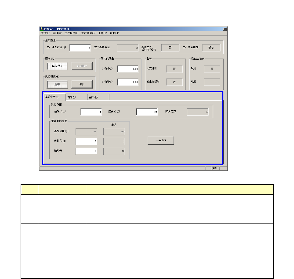 操作手册Ⅱ 2-9 (2) 试打 No. 项目 内容 1 试打电路 设置试打的电路 。单板基板时不 使用。 · 所有电路: 对所有电路试 打范围中设置的 元件进行贴片。 · 基准电路: 对基准电路试 打范围中设置的 元件进行贴片。 · 指定电路: 对指定的电路 试打范围中设置 的元件进行贴片 。 此时显示指定的电路号 。 2 试打范围 设置试打范围。 · 指定贴片点 :仅对贴片数 据的试打项设置 为 “ 是 ” 的贴片点。 · 指定…