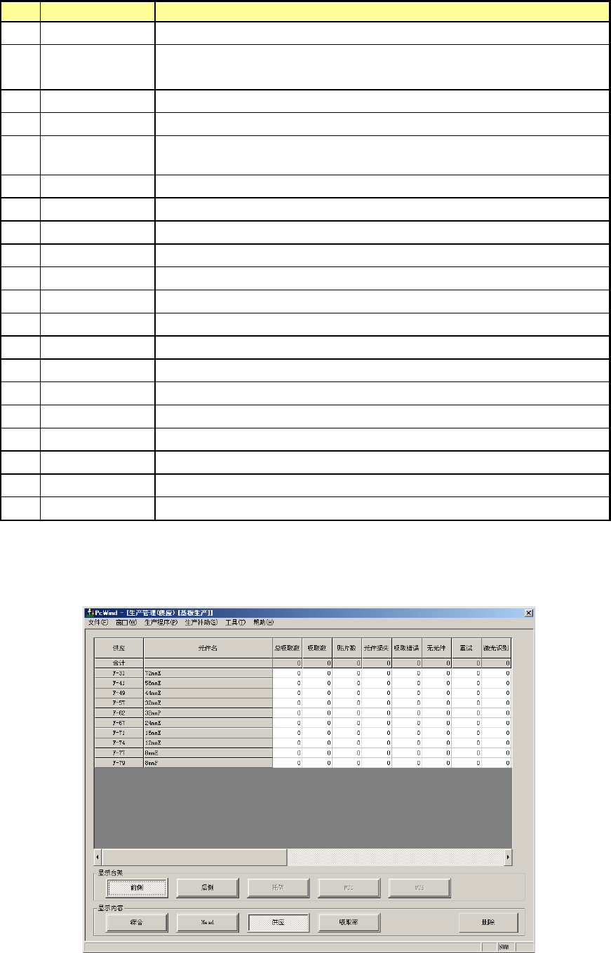 操作手册Ⅱ 2- 14 (4 )生产管理信 息( Head ) 显示每个 Head 的生产管理信息。 显示内容项目: 变更管理信息显 示的内容 。 No. 项目 内容 1 显示内容 综合 显示综合管理信 息。 2 Hea d 显示每 1 个 He ad 的生产管理信 息。 3 供应 显示每 1 个供应位置 的生产管 理信息。 4 吸取率 显示每 1 个供应位置的 吸取率排序。 5 删除 删除生产管理信 息。