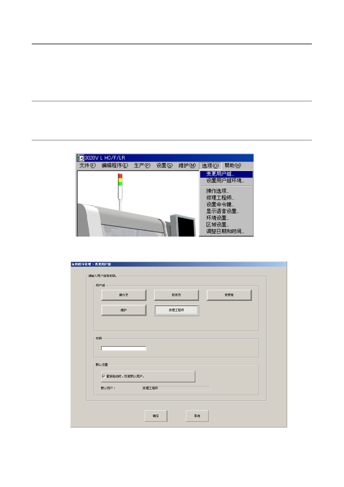 操作手册Ⅱ 3-3 ● 操作员 ∶ 有资格 执行生产准 备的用户级 别。 可执行生产,但 不能进行程序编 辑及各种 设置。 ● 程序员 ∶ 可制作 生产程序的 用户级别。 限制机械操作等 。 ● 管理员 ∶高于 “ 程序员 ” 的水平,属于机 器管理人 员。 有资格选择 “ 机器设置 ” 、 “ 手动控制 ” 、 “ 自动校准 ” 项目。 但是,不能进行 目的为机械修理 及重新调 整等的操作。 ● 维护员 ∶ 有资格 进行主机版 本升级…