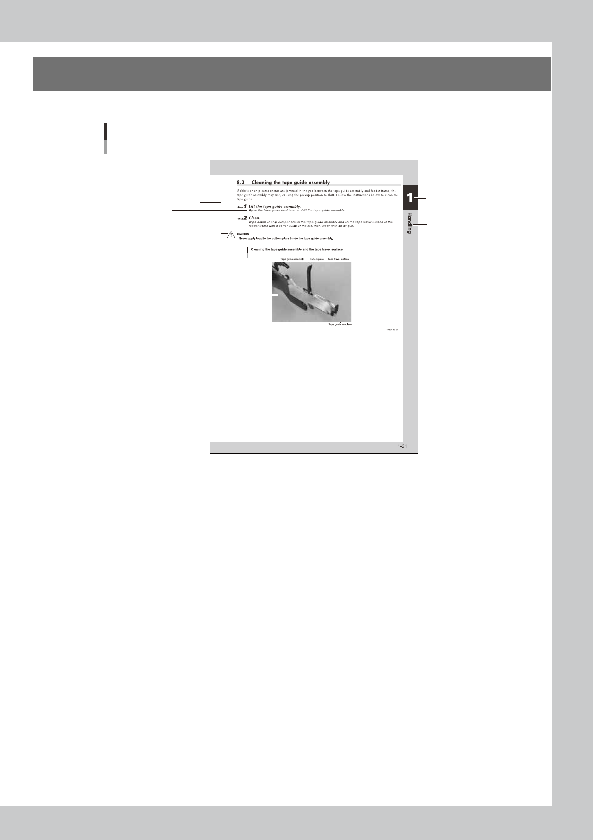 viii Before using the machine 4. Chapter Contents Chapter 1: Handling T he chapter describes outline of F3 tape feeder , setup of components, adjustment of parts and how to deal with troubles. Chapter 2: Replacing par ts…