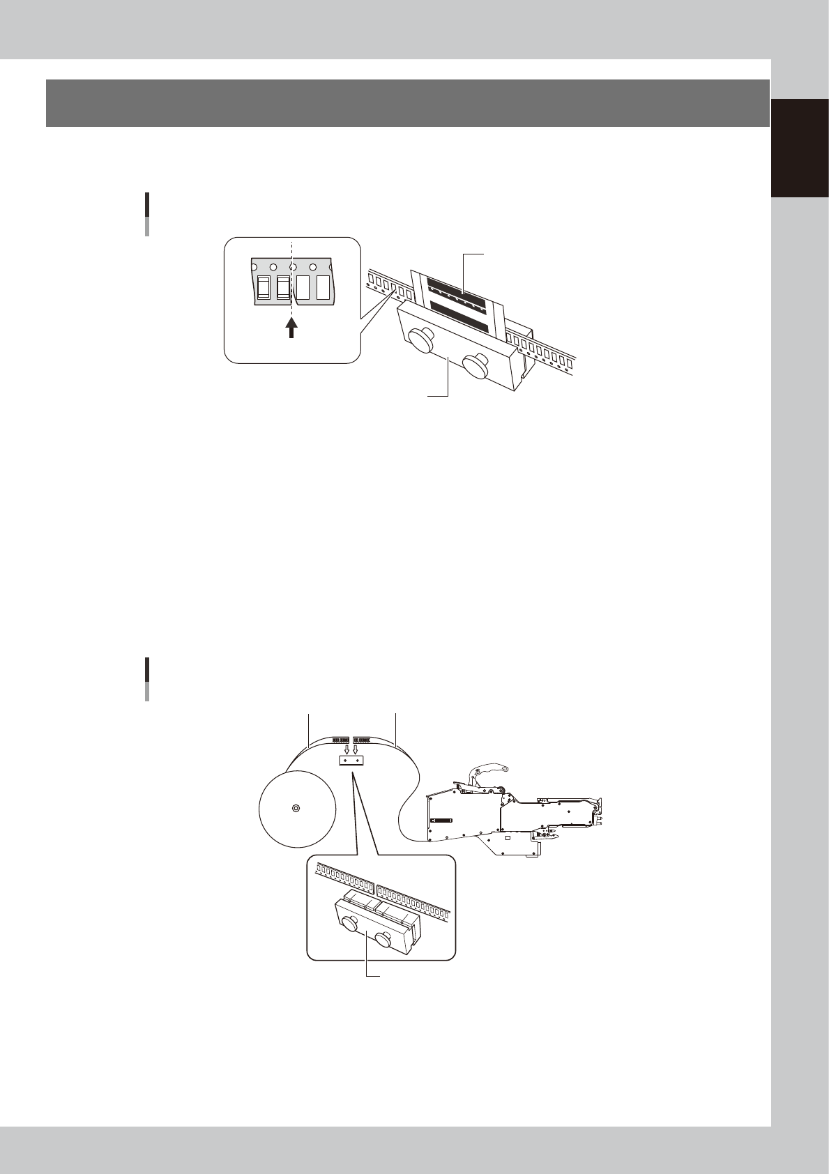 The clamping part has two pins. Gently slide the tapes back and forth and fit the feed holes into the