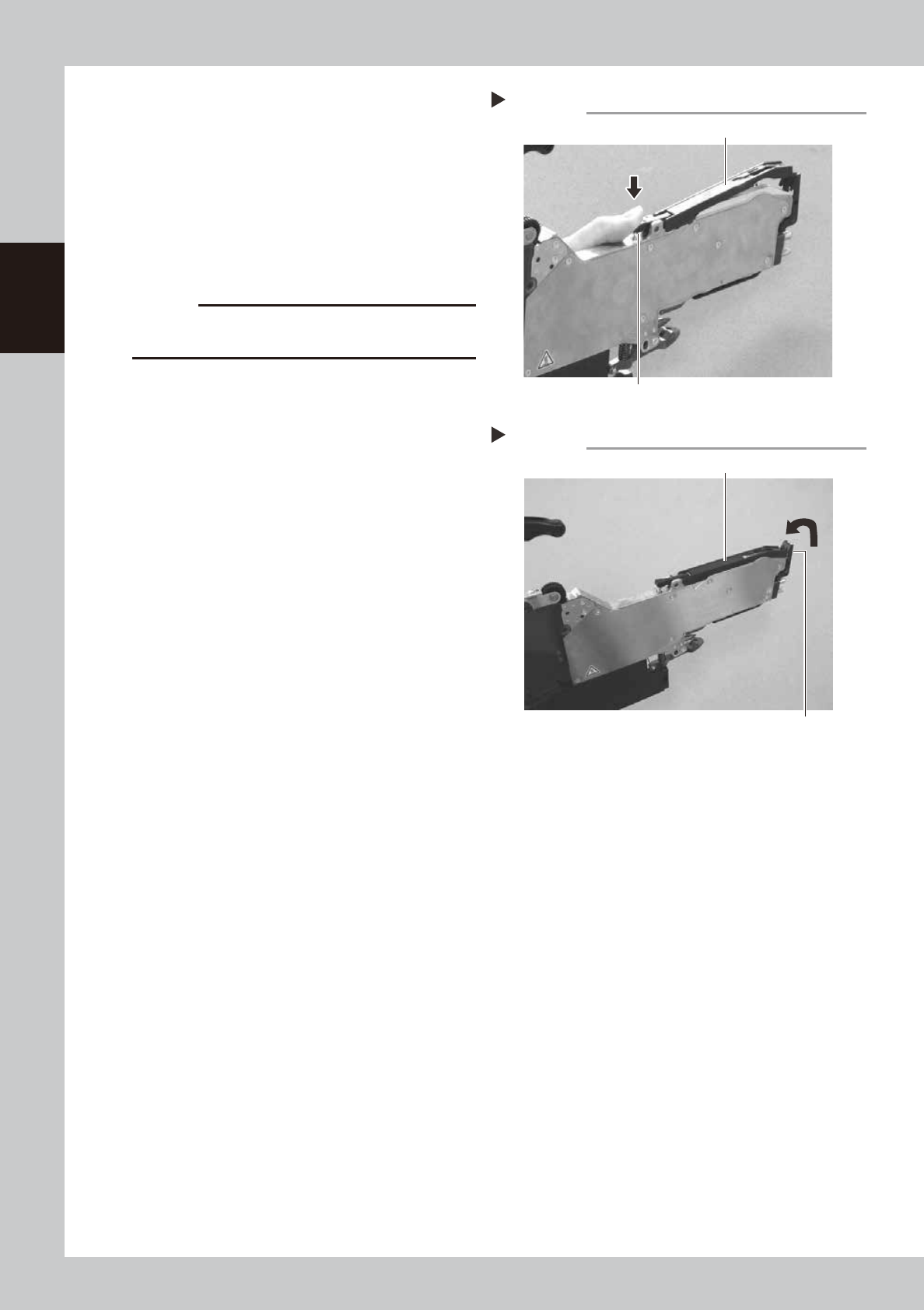 2-7 2 Replacing parts 4. T ape guide rear lever 4.1 Removal 1 Lift the tape guide assembly . Open the tape guide front lever and lift the tape guide assembly. 63202-9L-10 2 Remo ve the tape guide assembly . Push down the…