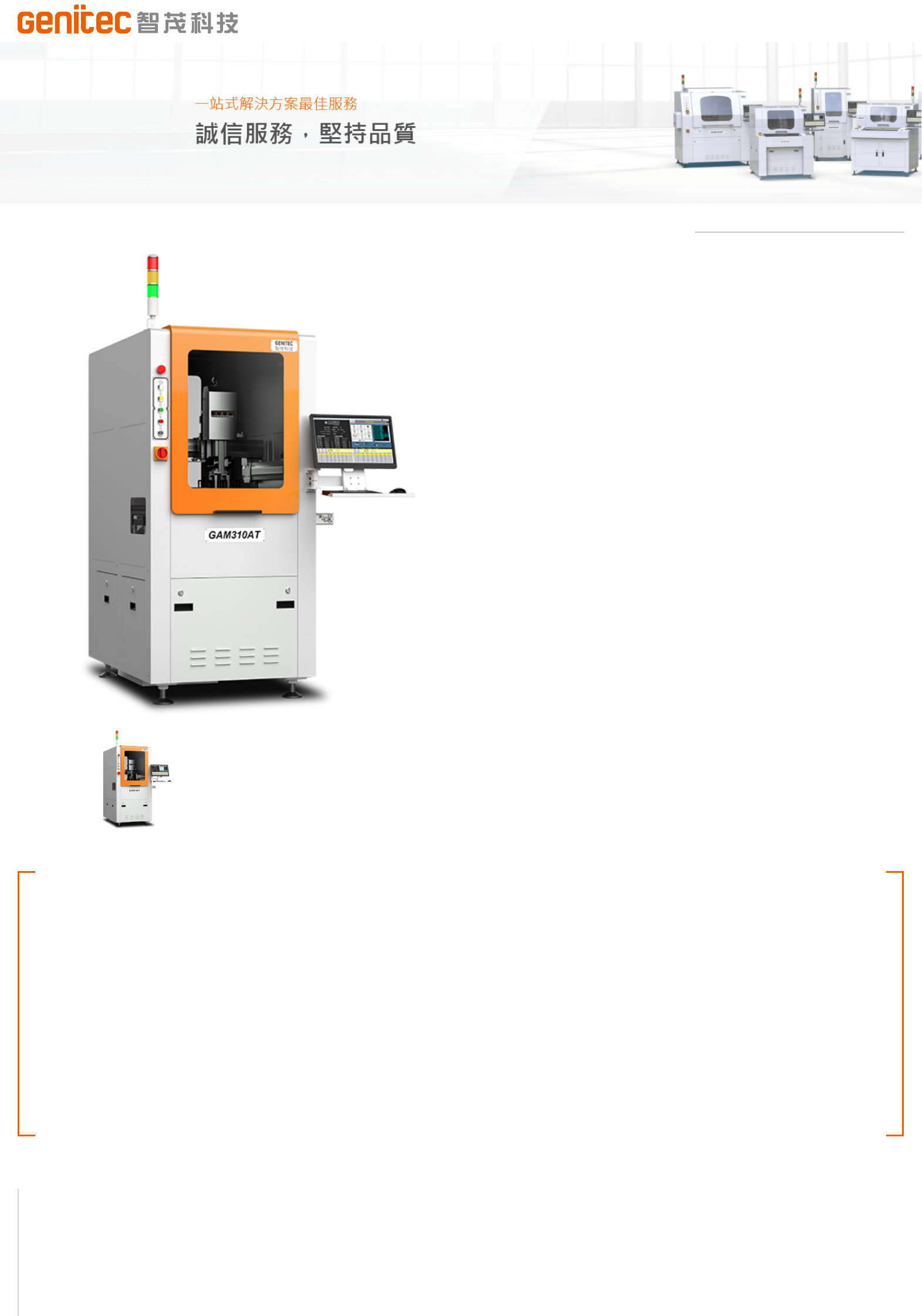 GAM 310A T 在線式全自動PCB分板機 GAM 310A T 在線式全自動PCB分板機 切割範圍200*180mm, 專用於手機板、小型PCBA分板 配置高速C CD視覺自動校正系統 採用高速ESD自動換刀主軸,減少PCBA因靜電造成的損壞 佔地面積較小,降低Cycle time, 提高生產效率 選配功能 雷射測高 條碼讀取器 刀徑檢測 MES 客制