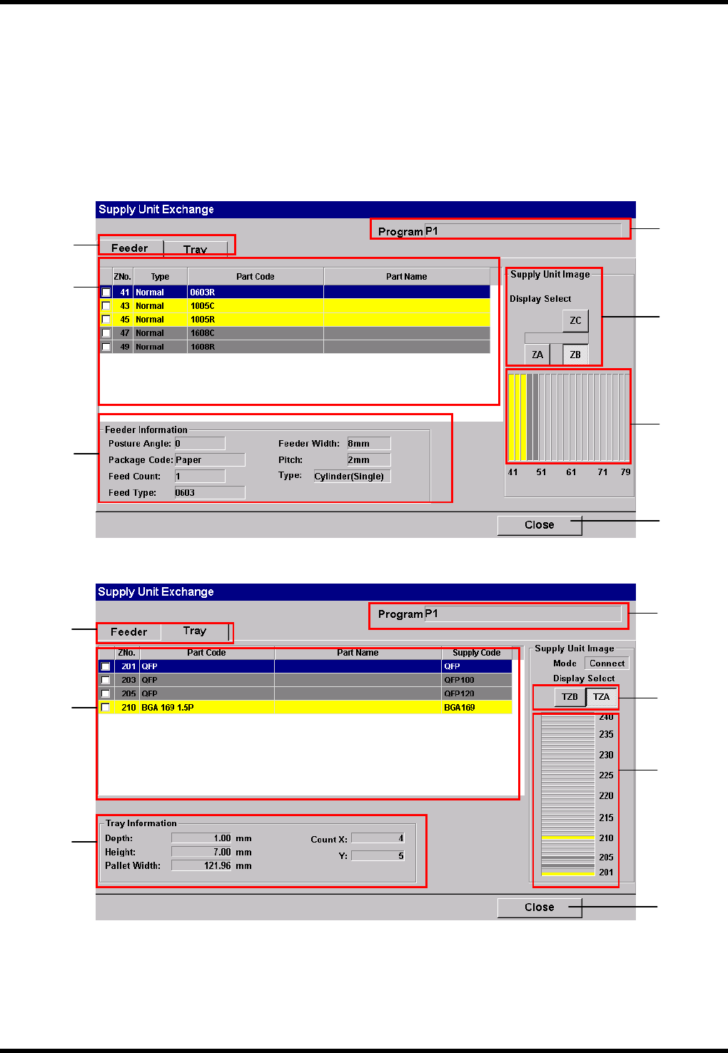 ‘Supply Unit Exchange(供给部交换)’画面显示至当前生产的品种程序之中使用的各供给部内配置的供料器信