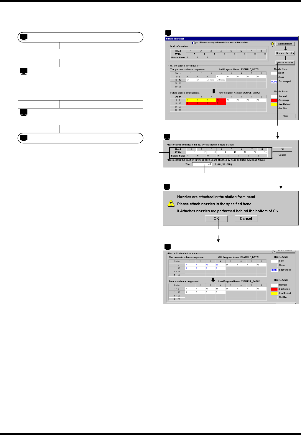 BM 231 操作手册 6.7 品种切换 E35OCC- 21-062-C0 6.7- 20 < A ttach Nozzles> ( 吸嘴安装 ) 的操作步 骤 如果按 < Attac h Nozzles> ( 吸嘴安装 ) 就 会显示出安装 动作的条 件设定画面。 请按照以下的步 骤进行吸嘴的 安装。 = 提示 = 1 未返回原点时, 因 ‘O rigin Ret urn Instr ucti on’ (…