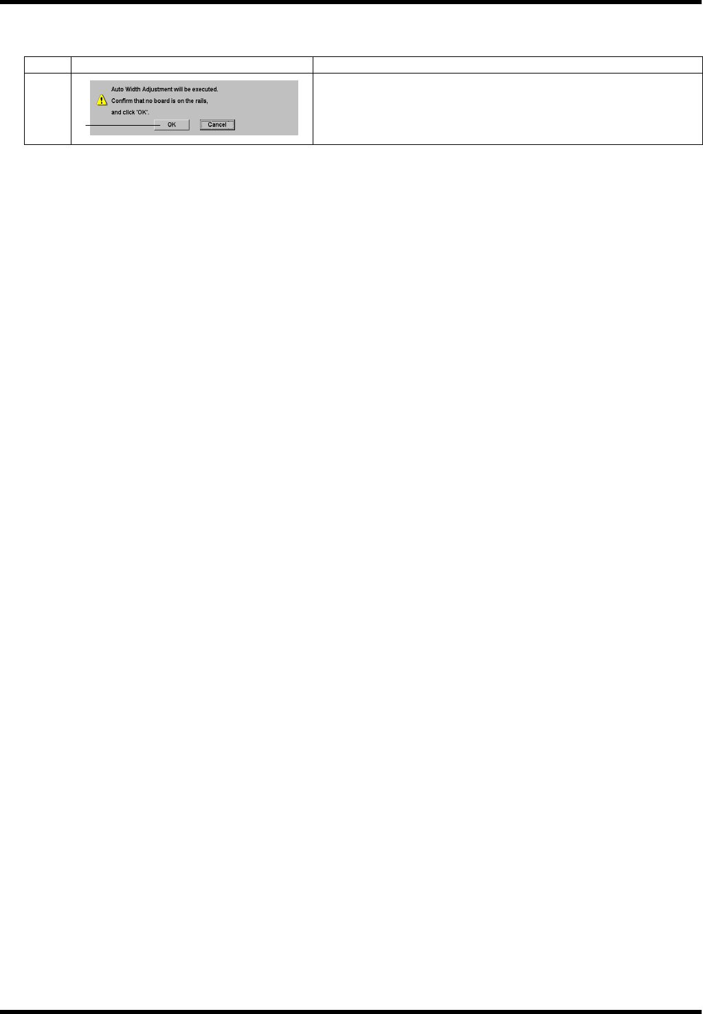BM 231 操作手册 6.7 品种切换 E35OCC- 21-062-C0 6.7- 22 6.7. 9 自动宽度调 整 ( 选购件 ) 步骤 操作 结果、参考 图 等 1. 根据所选程序的 基板数据, 基 板搬送部自动进行自 动宽度调整。 = 提示 = <Wid th Adju s t( 自动宽度 调整 )> 是指在配 置了自动宽度 调 整选项的设备上 , ’W i d t h Ad j u st ( 自动宽度调 整 )…