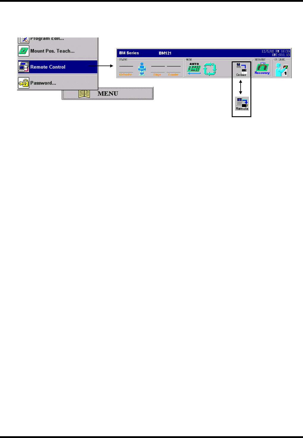 BM231 操作手册 4.3 生产 画面 E35OCC-15- 062-C0 4.3-7 4.3.12 < Remote Con trol > (遥控) 点击 < Rem ote Control > (遥控),通信模式会在 ‘O nline’ 和 ‘Rem ote’ 间切换。 在 ‘Remote’ 上加上 ‘Onlin e’ ,可从主机上进行 遥控。