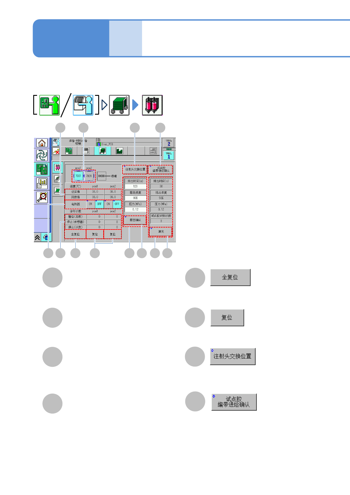 NPM-D3 EJM6DC-MB-02O-09 2-5-7 -2 排出确认的准备设定 对每个生产数据 (MJS) 的机种切换之后的 准备进行设定。 I ・ 压力 (MPa) 输入并显示排出粘着剂的压力。 K 充填的准备显示 显示包含生产数据 (MJS) 内点胶在内的批 量切换之后的准备内容。设定通过 DGS 执 行。 显示排出粘着剂之际的螺丝轴的旋转 速 度。 ・ 压力 (MPa) 显示排出粘着剂的压力。 ・ 试贴确认次数 显示对试贴进…