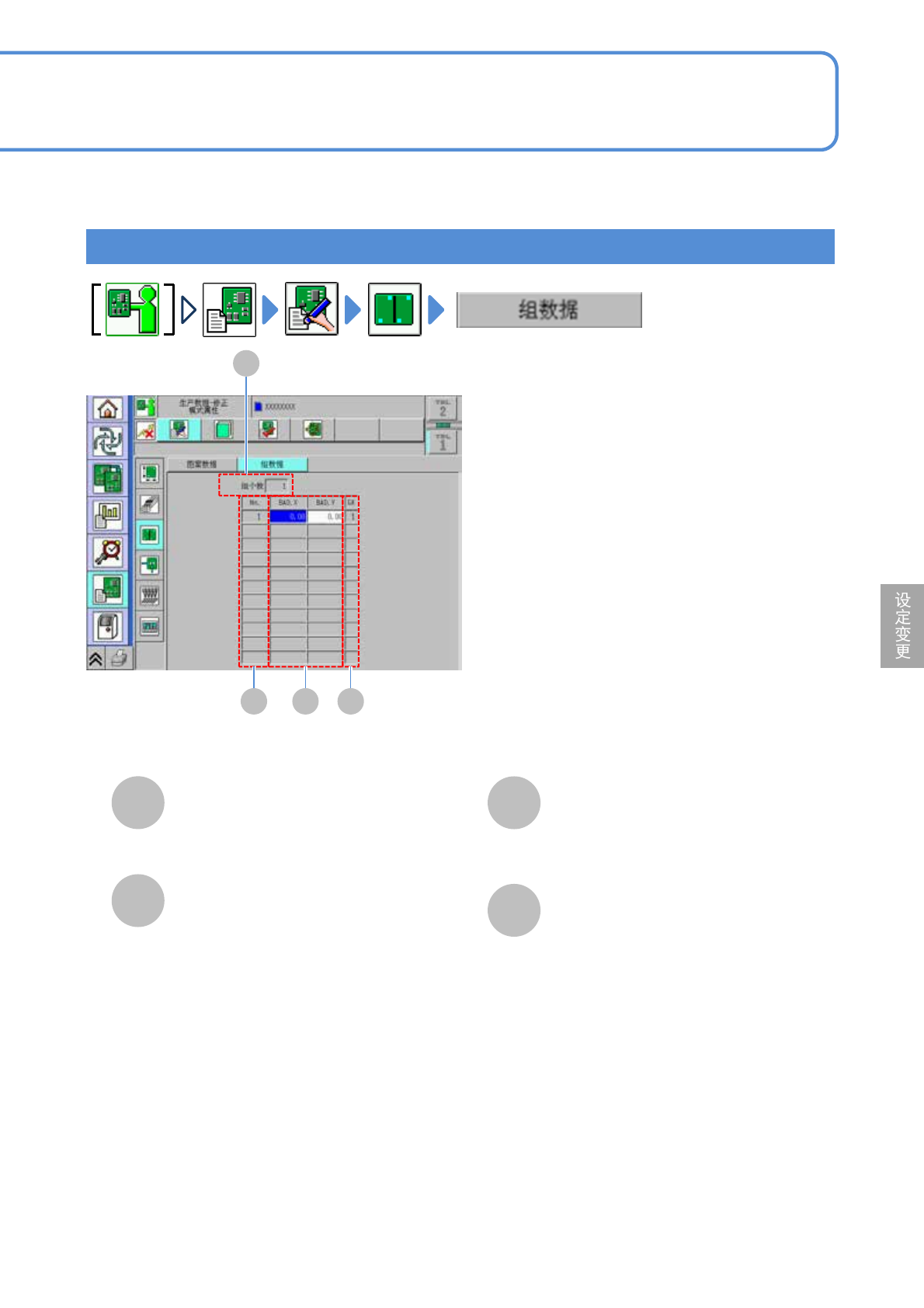 NPM-D3 EJM6DC-MB-06O-09 C A B 组个数 D GK BAD.X/BAD.Y A No. B C D 组 登录的组数据的总数。 图案组的识别编号。 不良组标记的 X/Y 坐标。 组数据的编号。 6-1-12 -2
