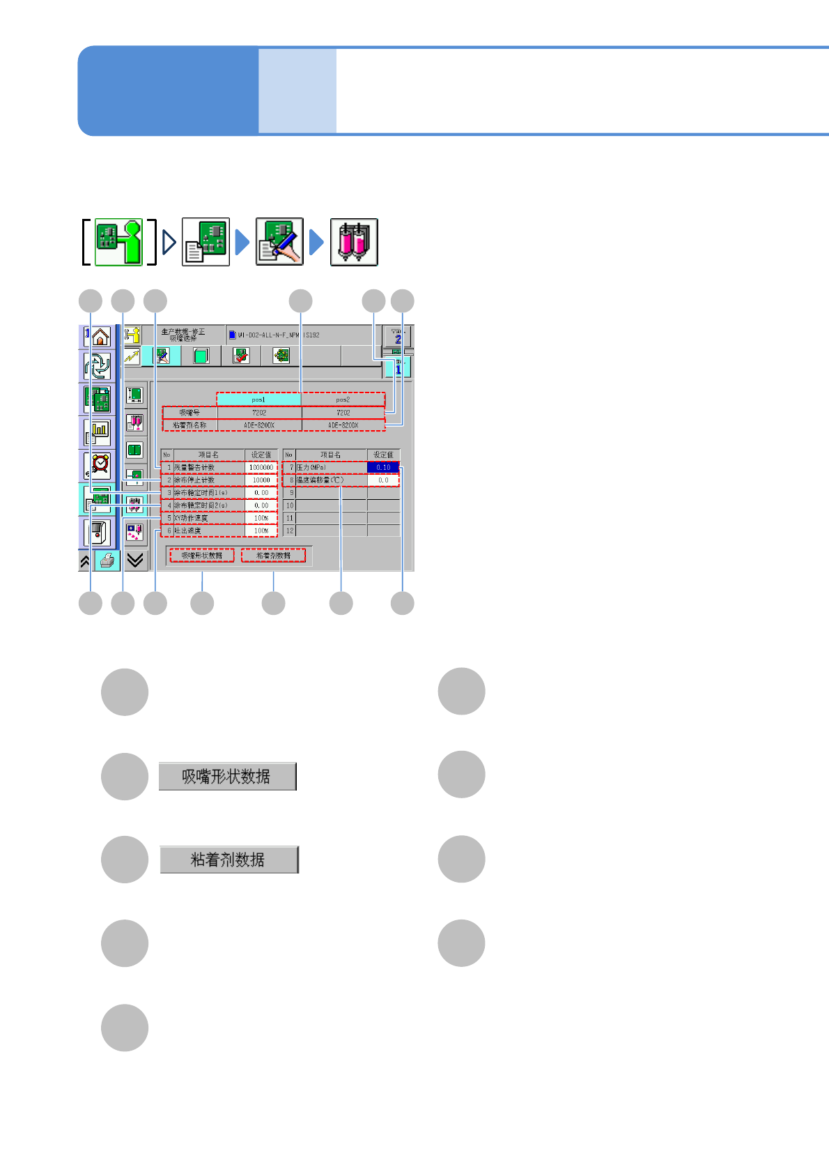 确认、修改各点胶头使用的吸嘴的控制参数信息。